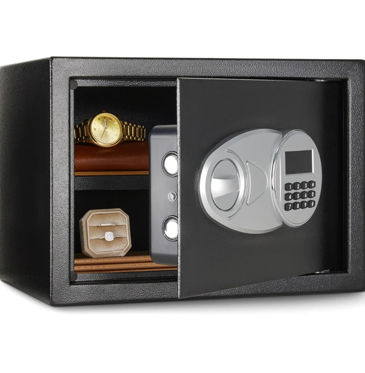 This black safe features a digital keypad and a key override option. It's made with a steel construction for durability. Includes internal shelves for organization. Ideal for storing valuables at home or in an office!