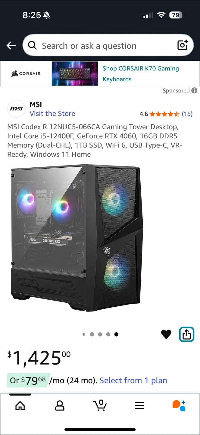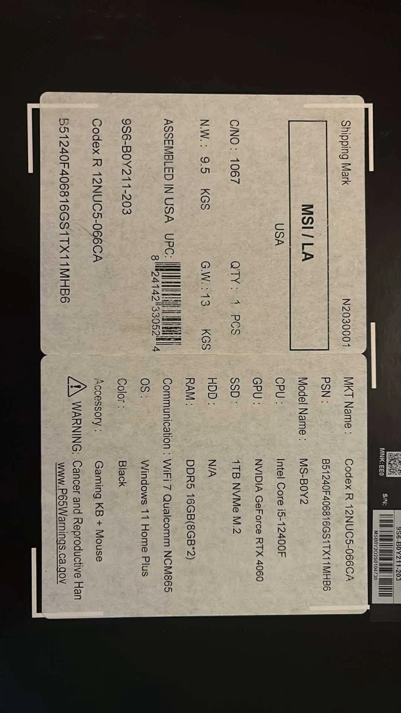 Selling a used MSI Codex R 12NUC5-066CA Gaming Tower Desktop in black. Key specs include: - Intel Core i5-12400F - NVIDIA GeForce RTX 4060 - 16GB DDR5 Memory - 1TB NVMe M.2 SSD - Windows 11 Home Plus Originally bought for $1425