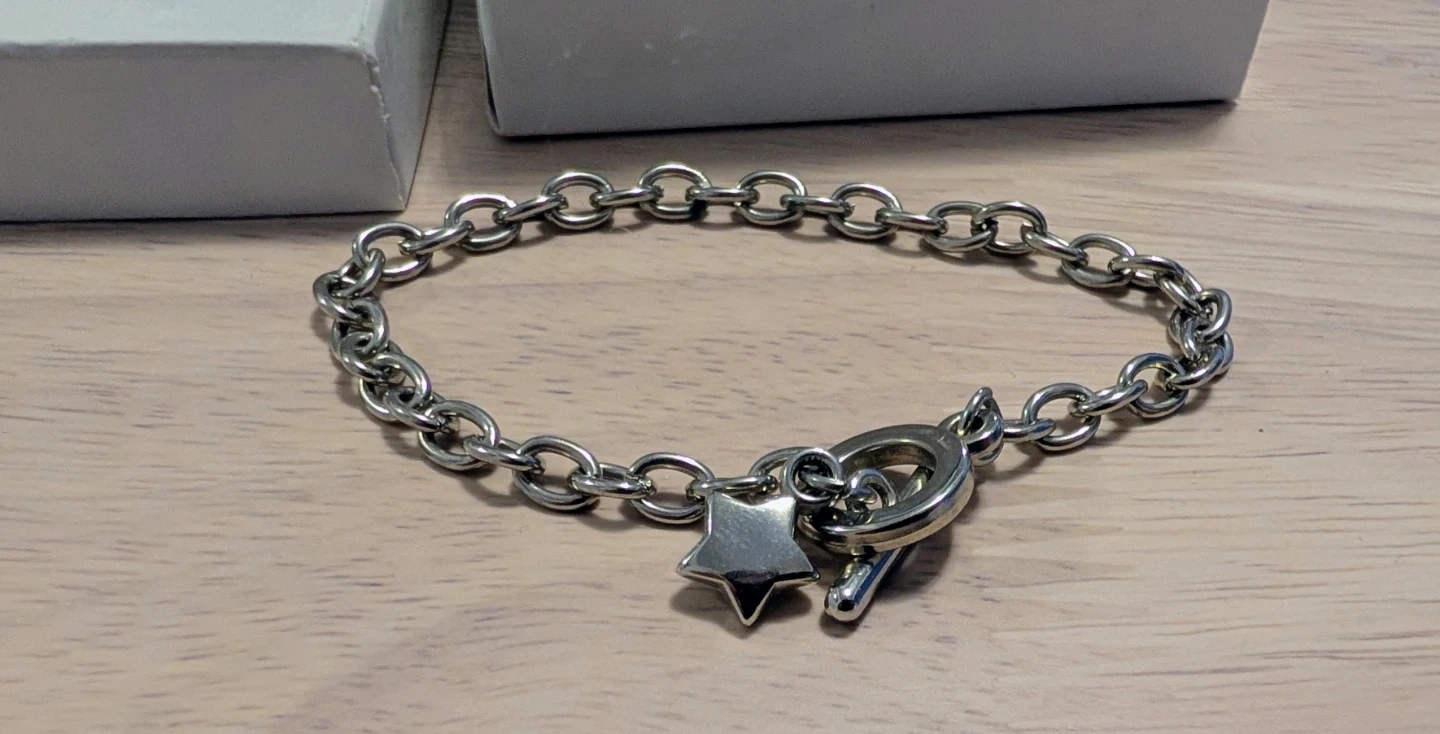 This elegant sterling silver bracelet features a toggle clasp and a charming star charm. It's perfect for adding a touch of sparkle to any outfit. Comes with a box.