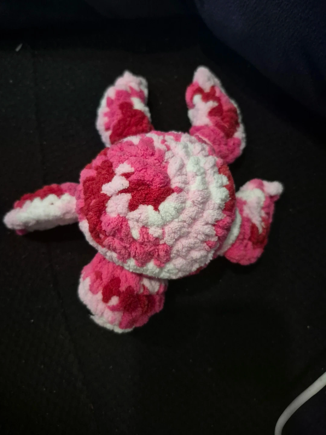 A super cute, handmade crochet turtle plush toy! It's made with soft, chenille-style yarn in a lovely pink, red, and white marbled pattern. This little guy's perfect for cuddling or as a cheerful decoration. It's a fun gift for kids or anyone who loves unique handmade items!