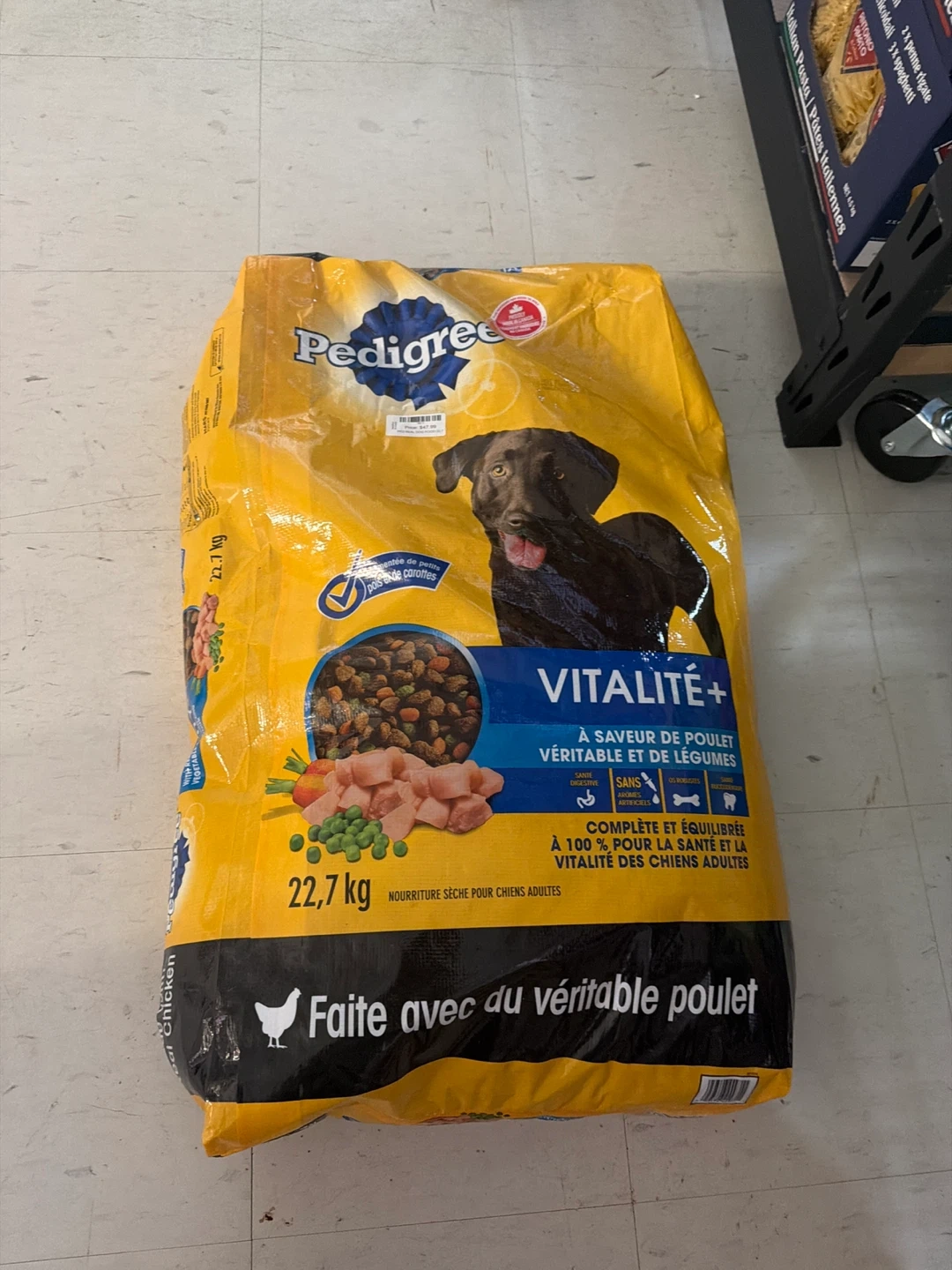 Pedigree Vitalité+ dry dog food with real chicken and vegetable flavour. It's complete and balanced for adult dogs. 22.7 kg bag.