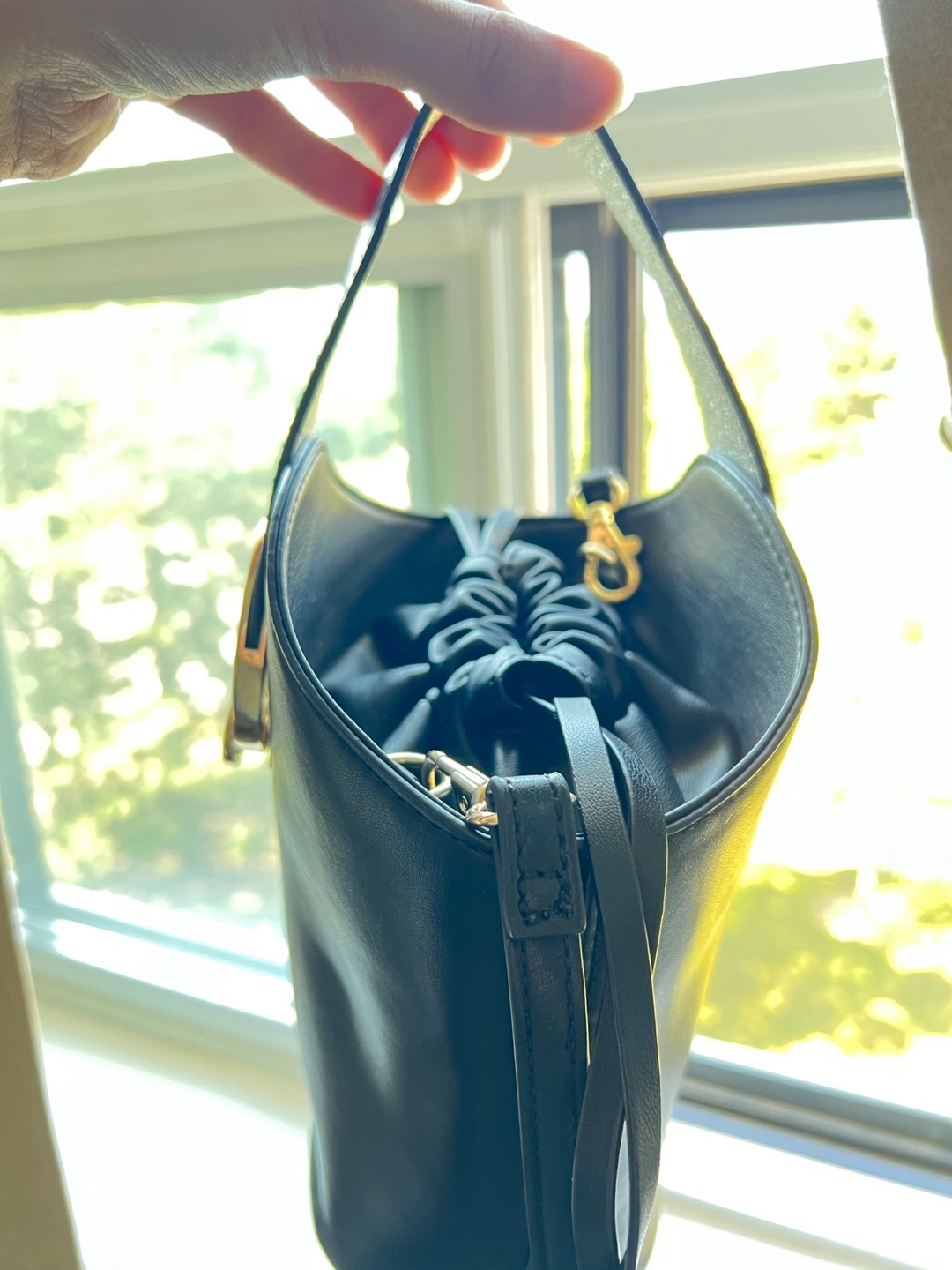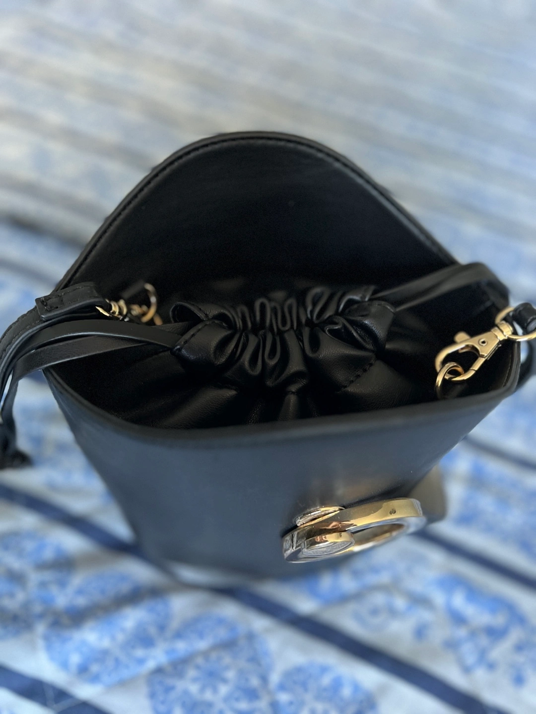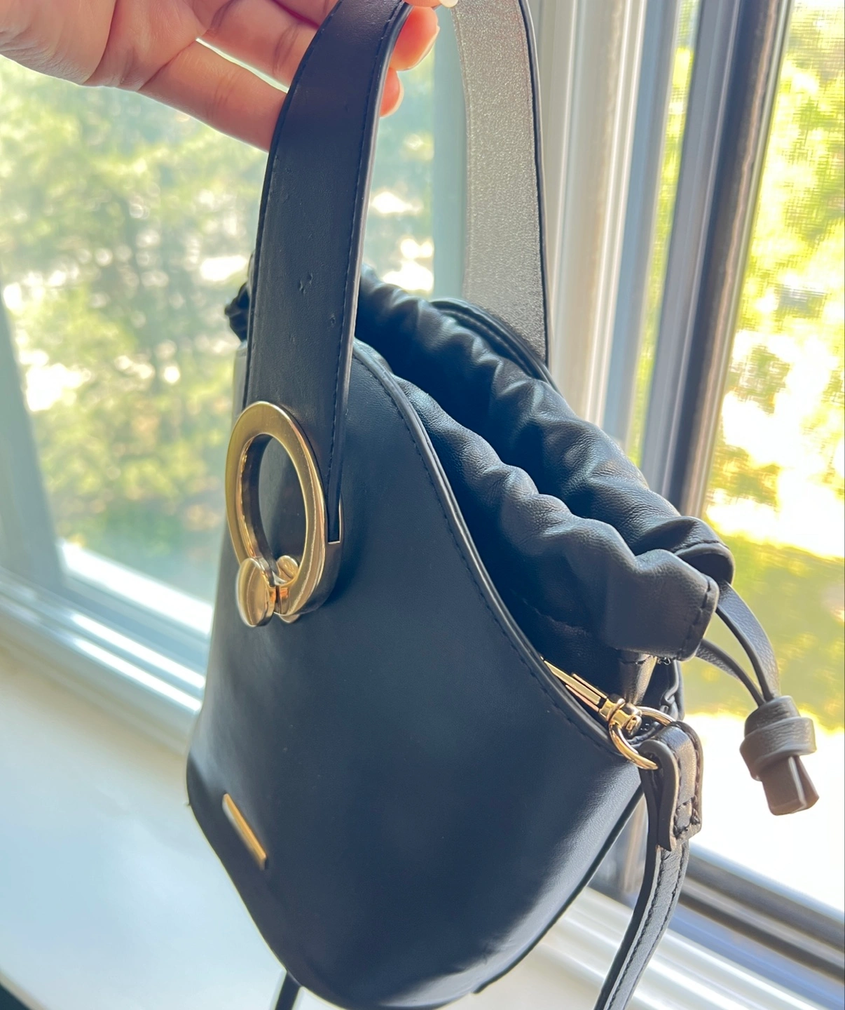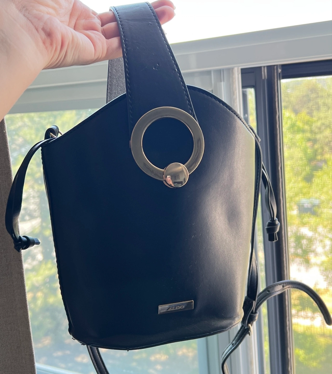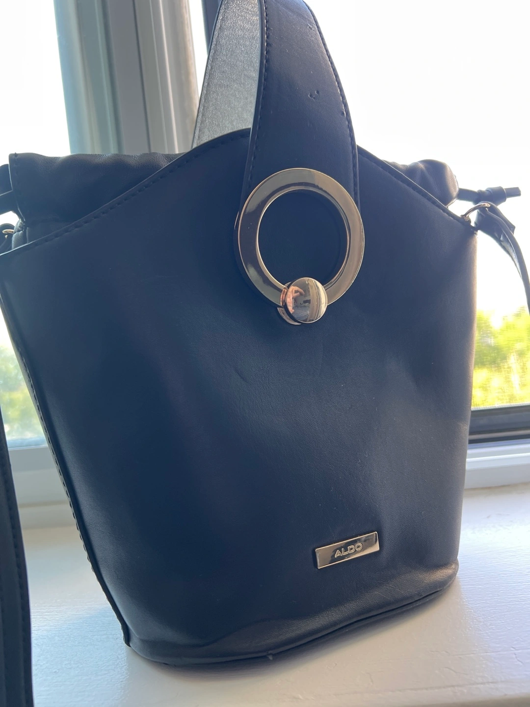 This Aldo bucket bag is in great condition! It's a stylish black colour and perfect for carrying your essentials. The bag features a unique ring detail and a drawstring closure to keep your belongings secure. It also has a detachable strap for versatile wear.