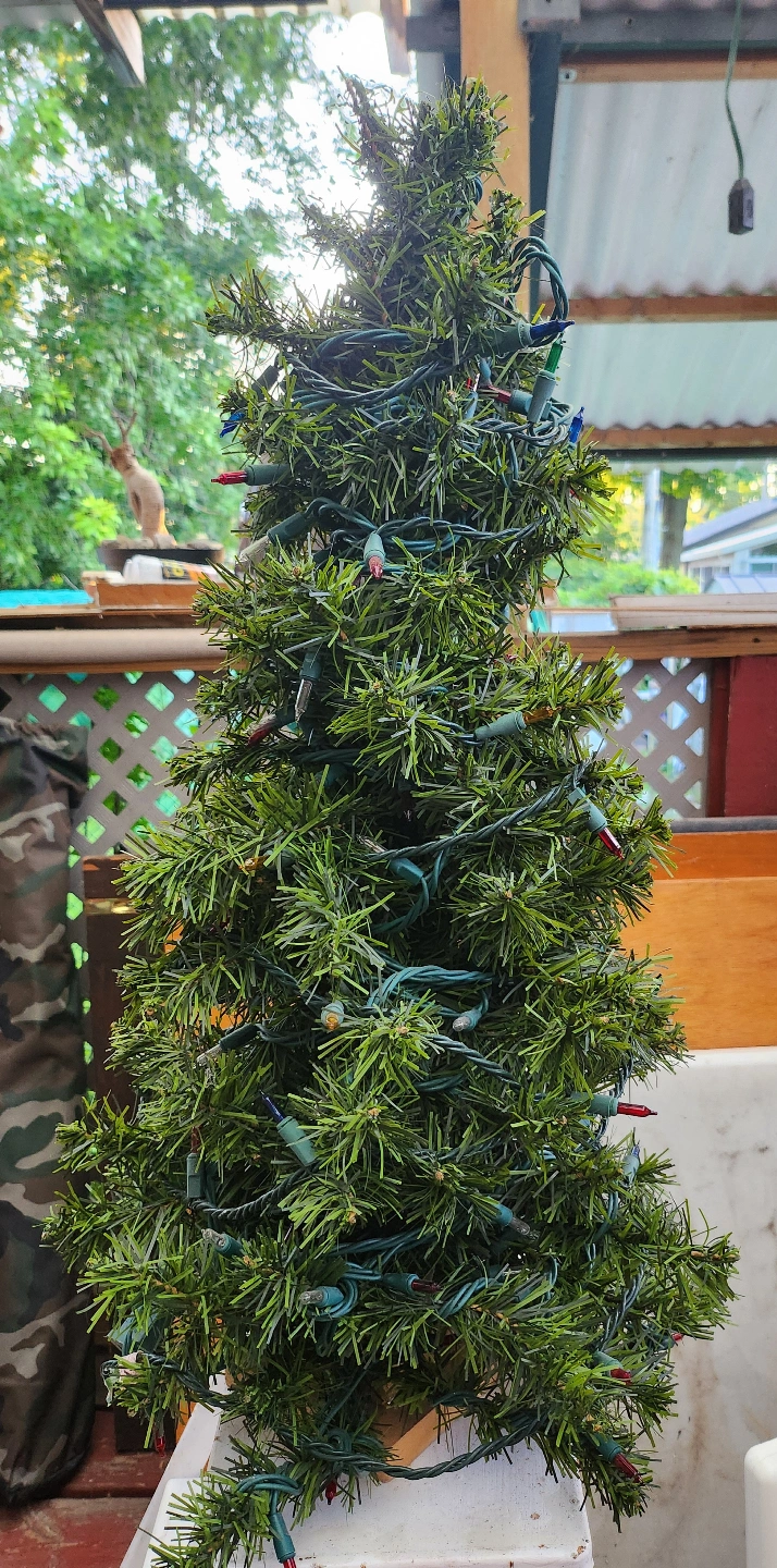 Small artificial Christmas tree. Pre-lit with colourful lights. Perfect for tabletop or small space. Used condition.