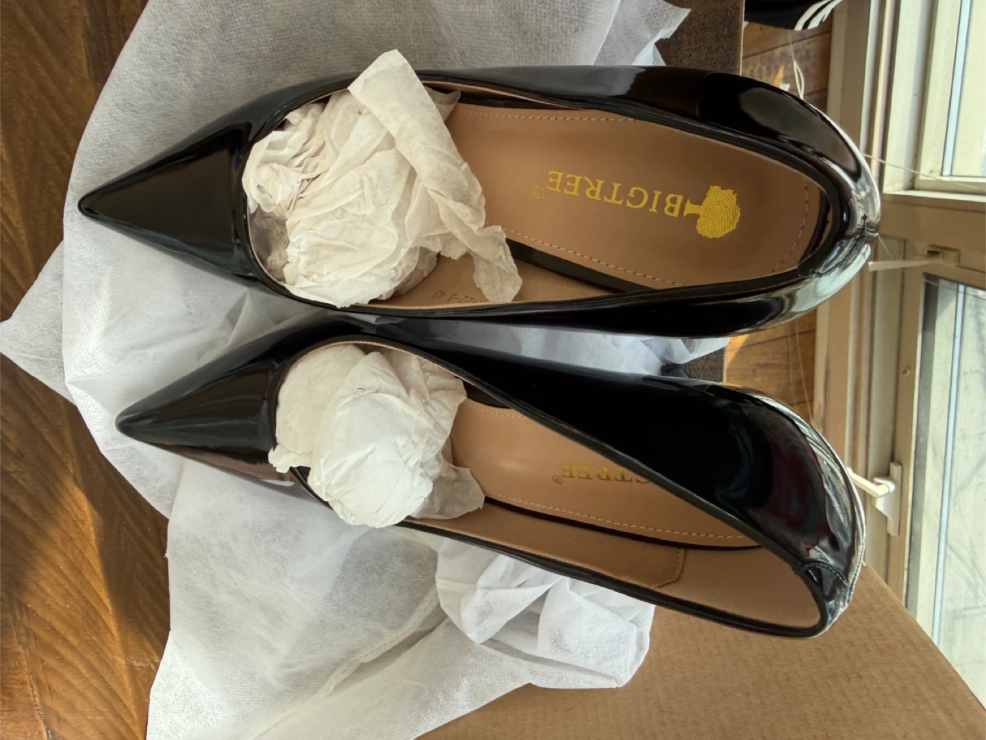 Classic black patent leather stilettos from BIGTREE. These feature a sharp pointed toe and a high stiletto heel. They're perfect for dressing up any outfit!