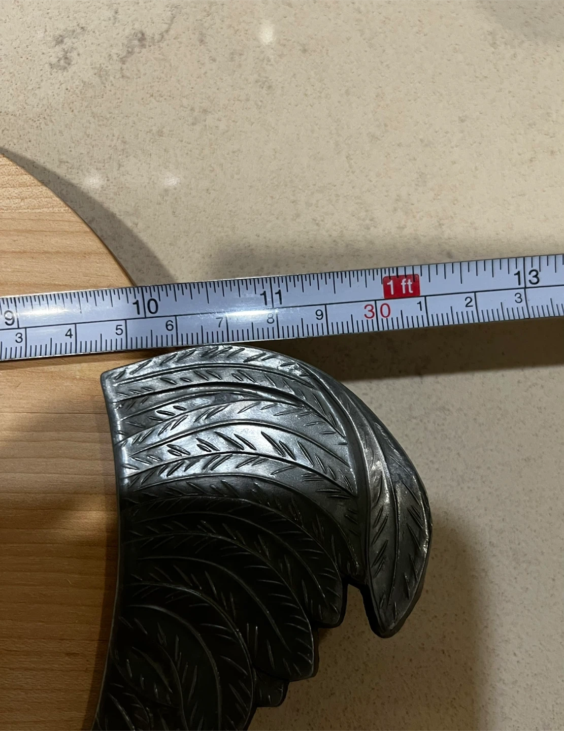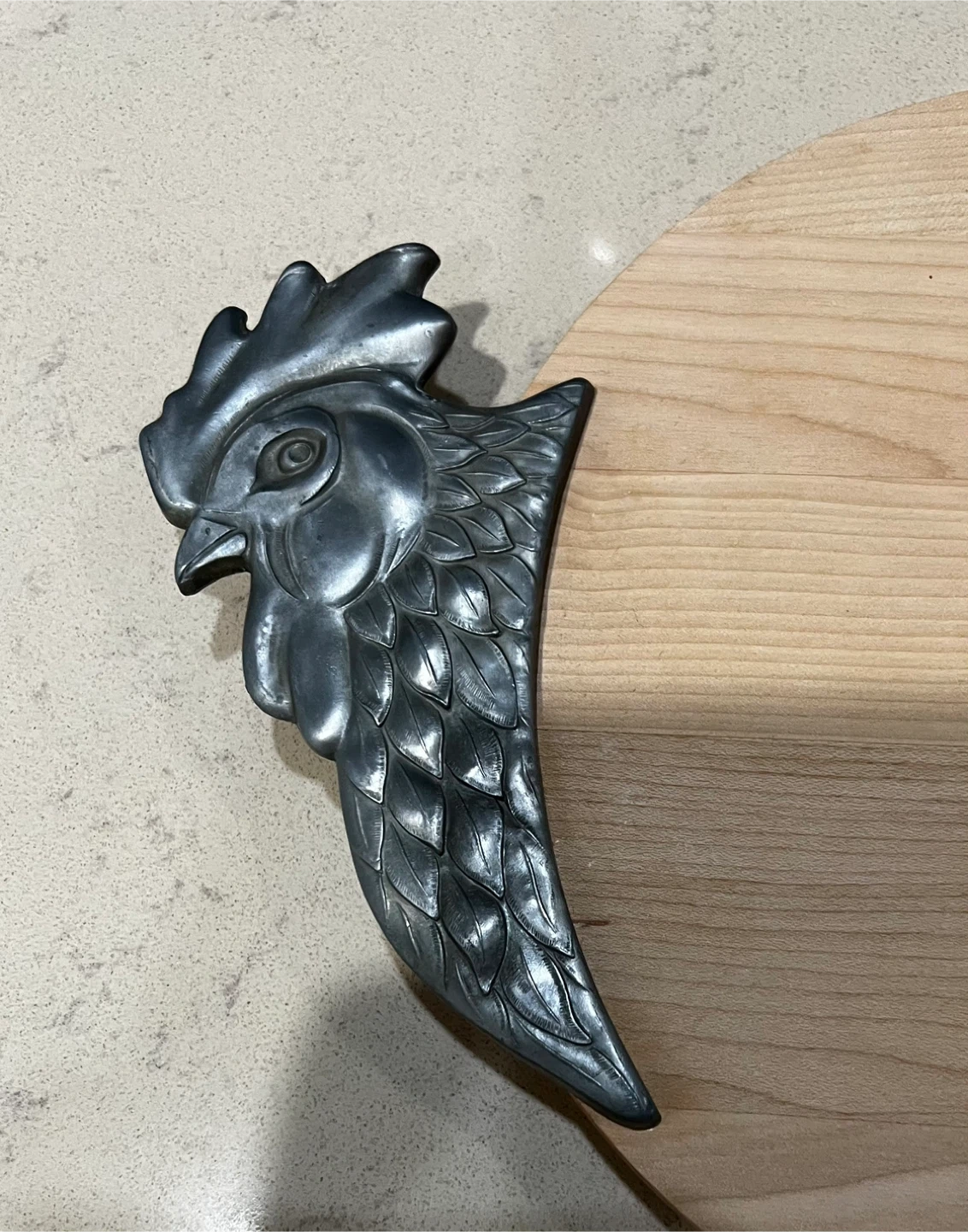 This unique cheese board features a wooden circular surface with decorative metal rooster and wing handles. It's made in France. Great for serving snacks or appetizers!