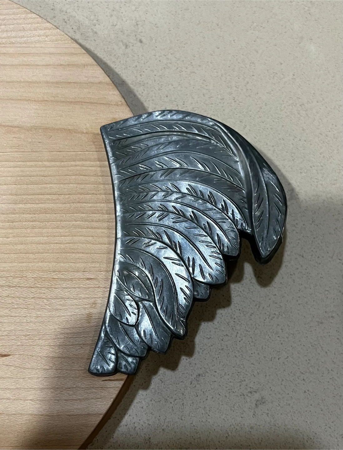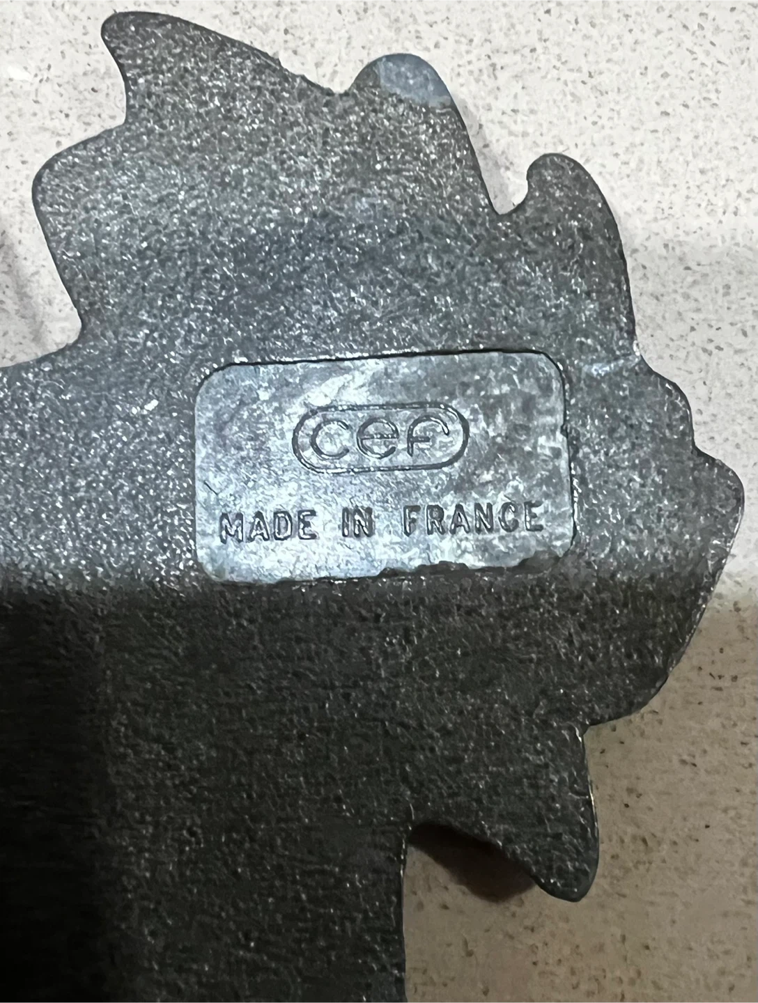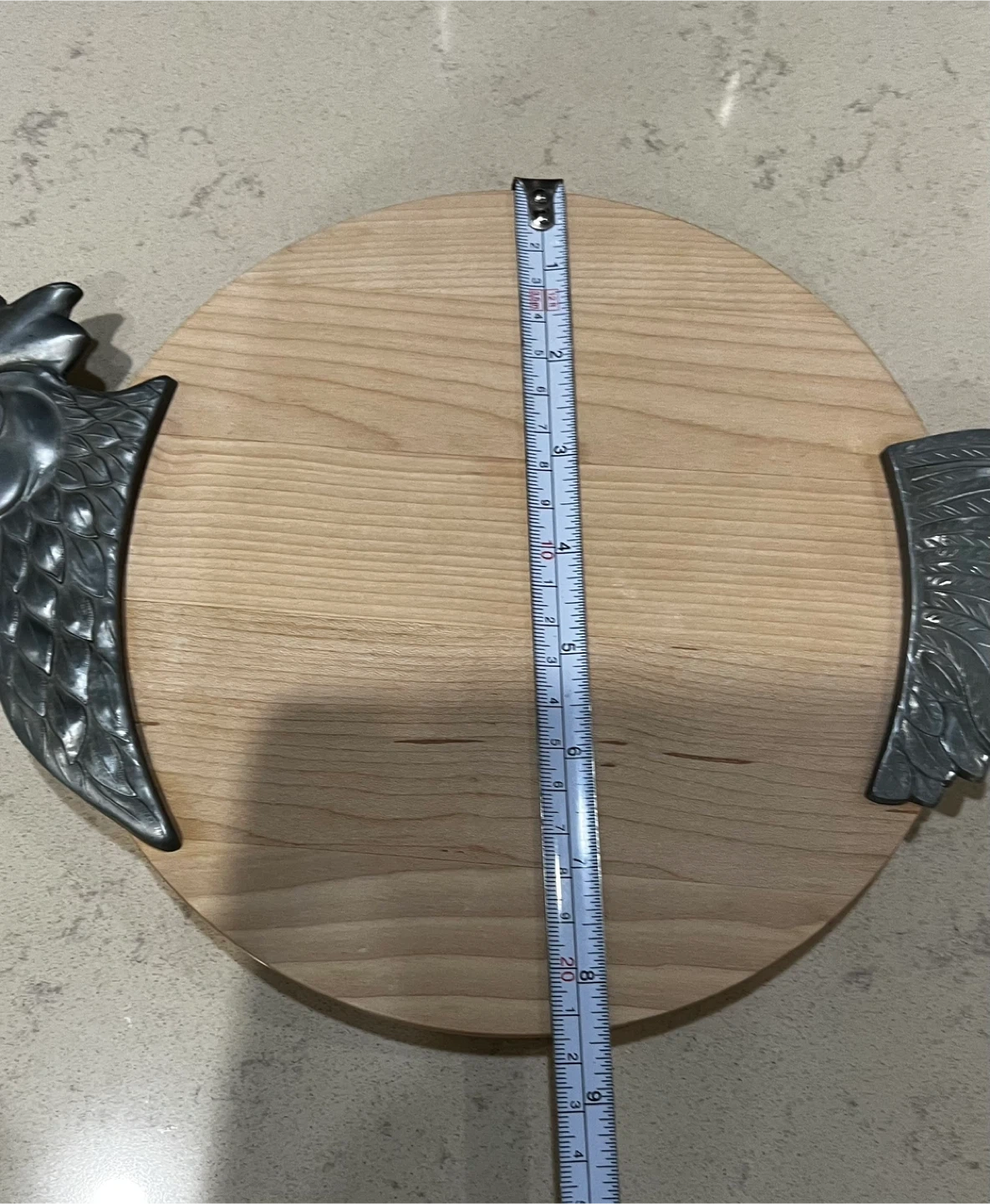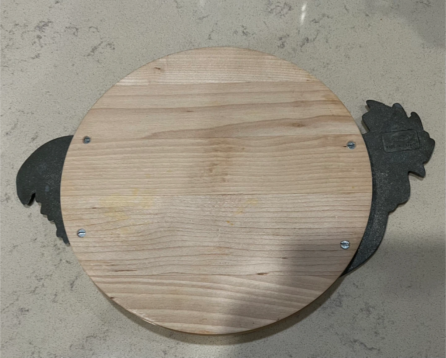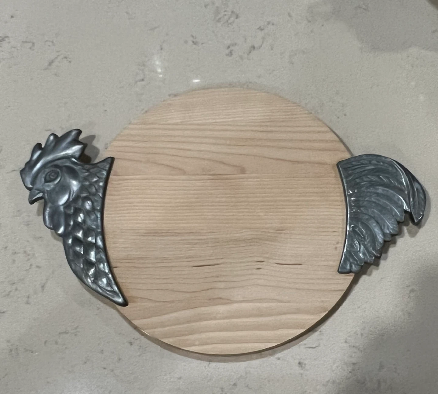 This unique cheese board features a wooden circular surface with decorative metal rooster and wing handles. It's made in France. Great for serving snacks or appetizers!