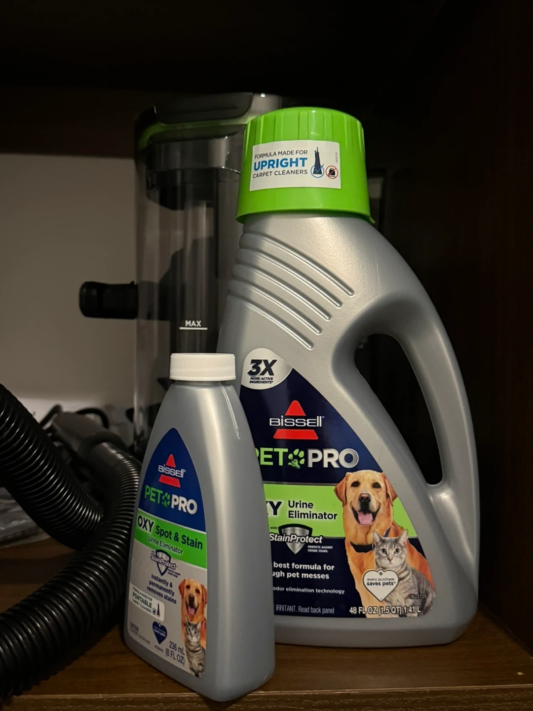 Bissell Little Green portable carpet cleaner for tough pet messes. Comes with a 48 oz bottle of Bissell Pet Pro Oxy Urine Eliminator and a 8 oz bottle of Oxy Spot & Stain. This formula is tough on pet stains and odors!