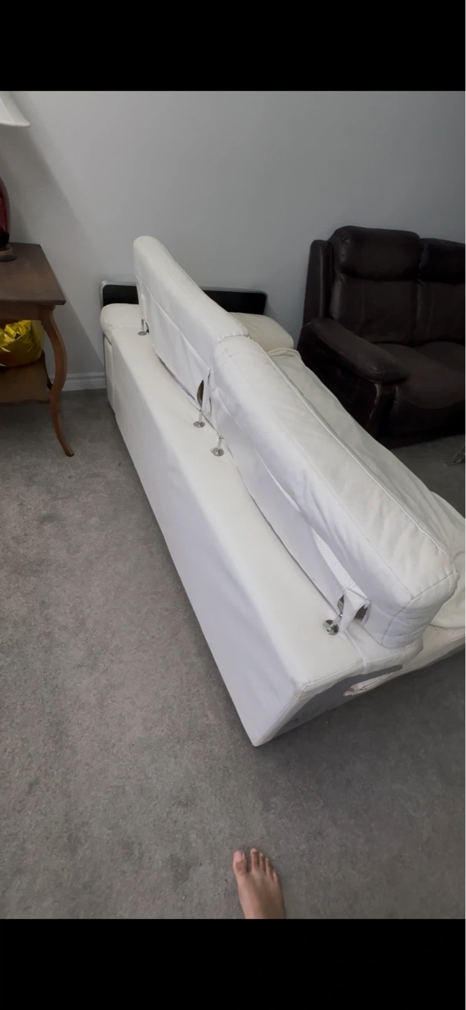 White leather sofa with a chaise. It's in good condition with some wear. Plenty of seating space for your living room!