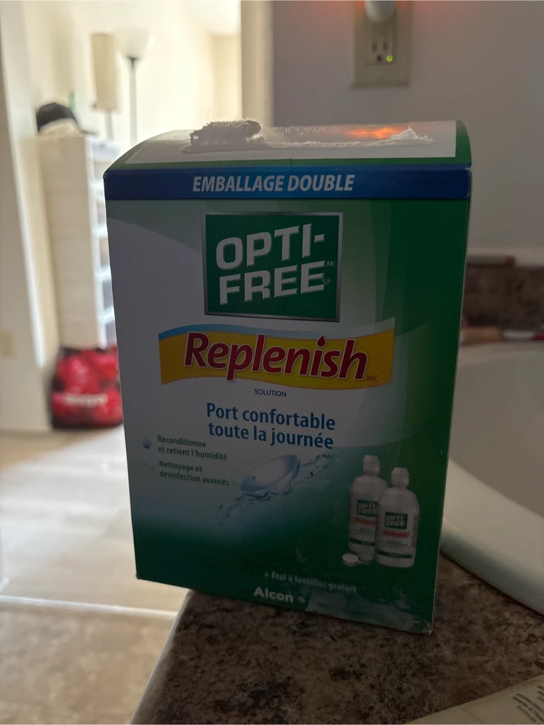 Selling a box of Opti-Free Replenish contact lens solution! It's designed to recondition and retain moisture, providing comfortable wear all day long. It also offers advanced cleaning and disinfection for your lenses. Comes with a free lens case