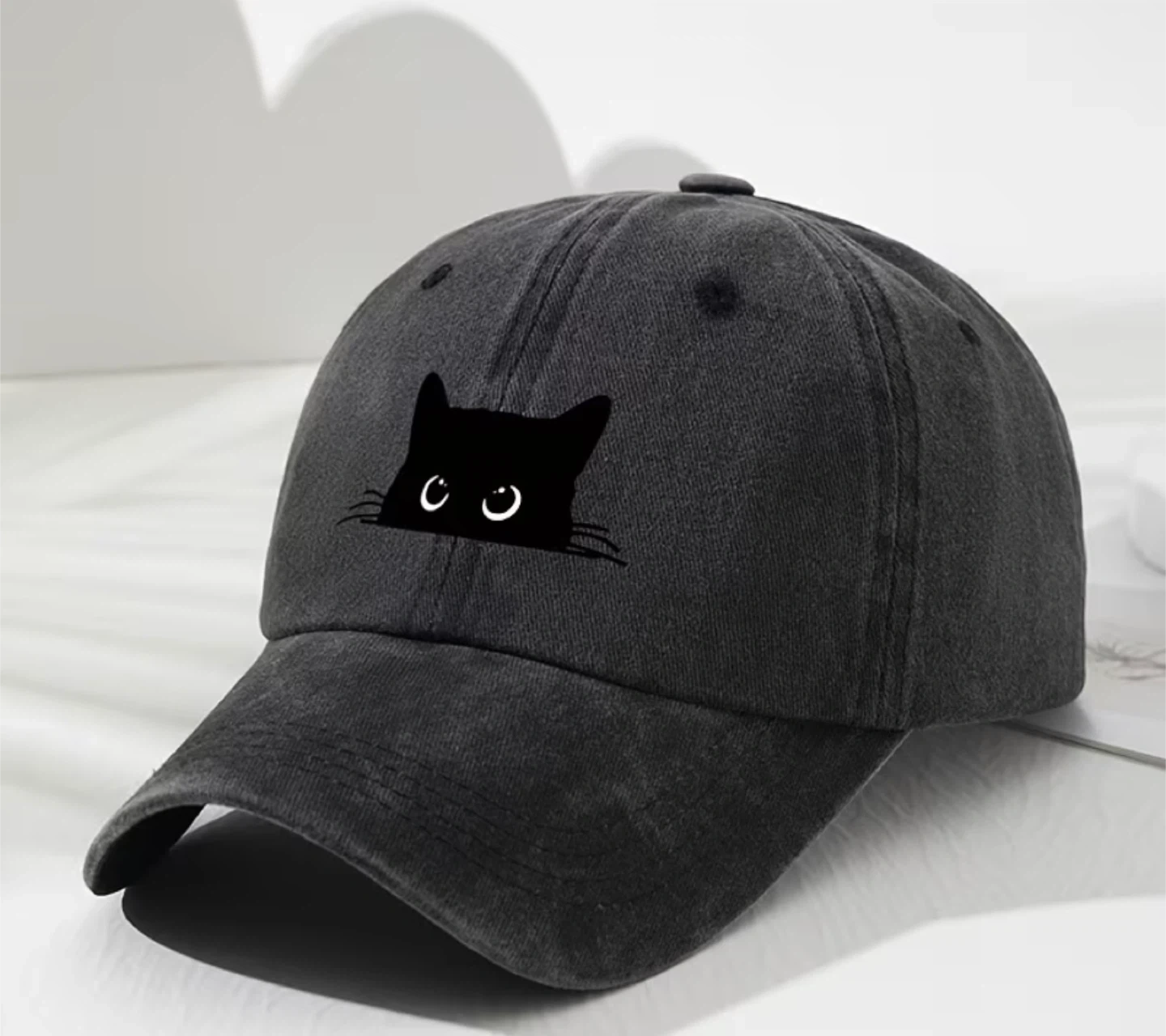 Selling a cute black baseball cap with a cat design! It's in great condition and perfect for adding a bit of fun to any outfit. The cap is adjustable for a comfortable fit