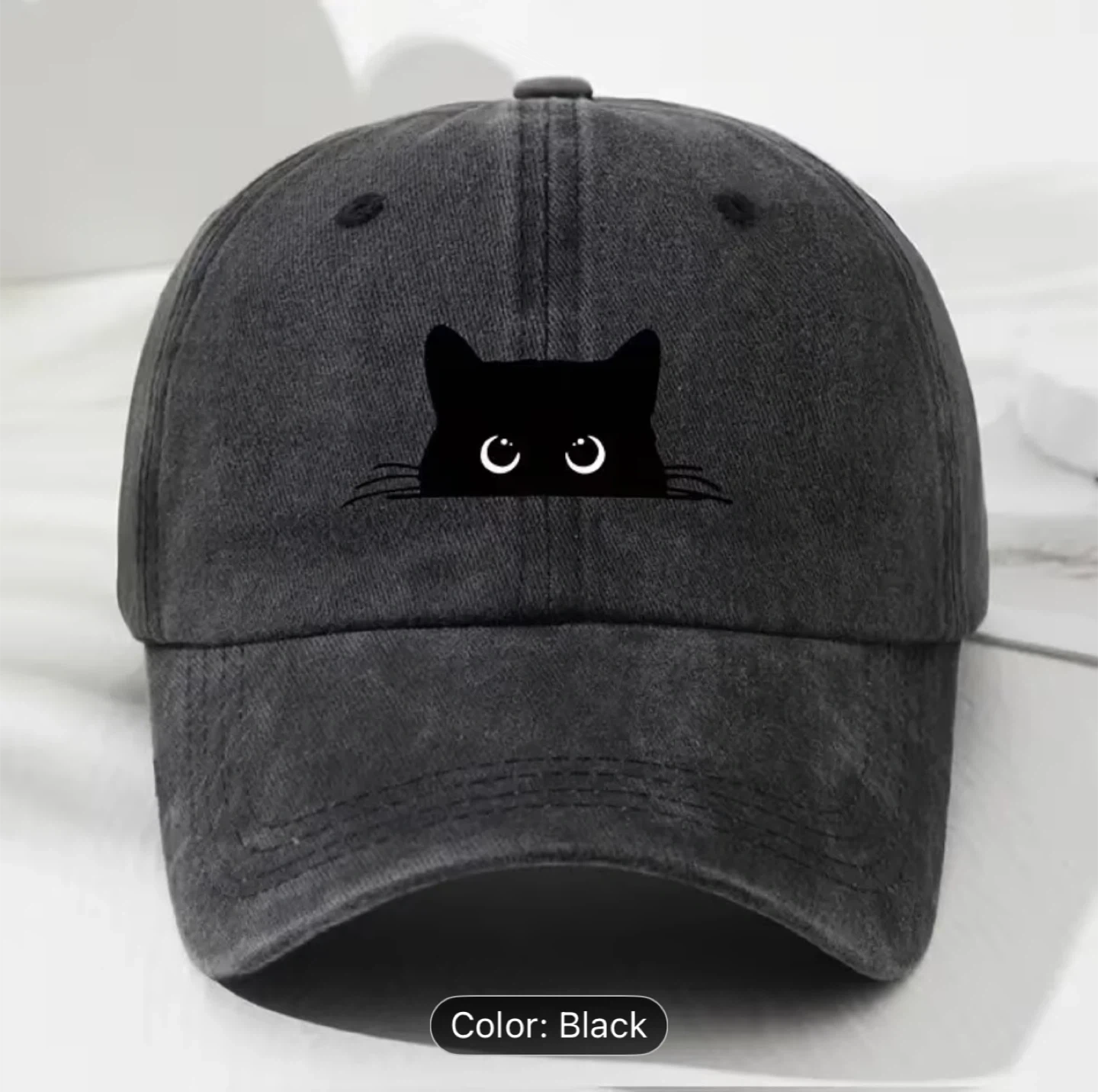 Selling a cute black baseball cap with a cat design! It's in great condition and perfect for adding a bit of fun to any outfit. The cap is adjustable for a comfortable fit