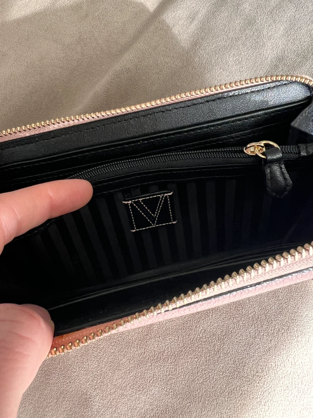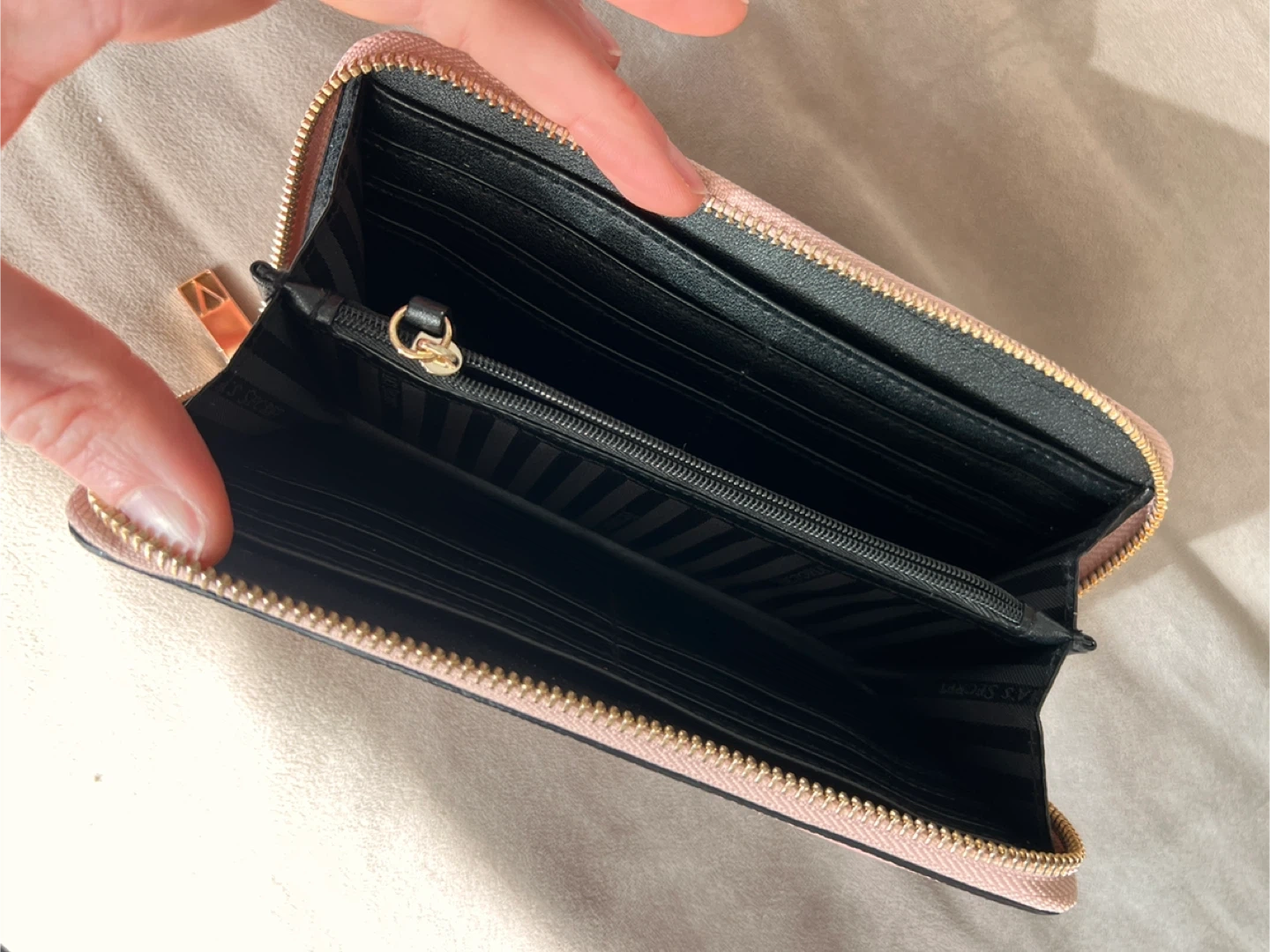 This pink zip-around wallet features a chevron pattern. It's got multiple card slots and a zippered coin pocket inside. A stylish accessory for your everyday essentials!