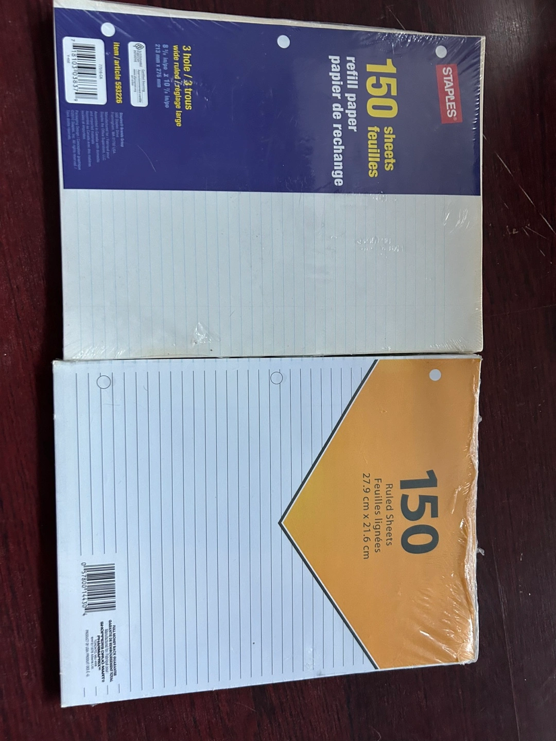 I have two packs of paper for sale, still sealed in their original packaging! Each pack contains 150 sheets of wide-ruled paper, perfect for school or office use. The paper size is 8 1/2 in x 10 7/8 in (213 mm x 276 mm). Great for all your note-taking needs!