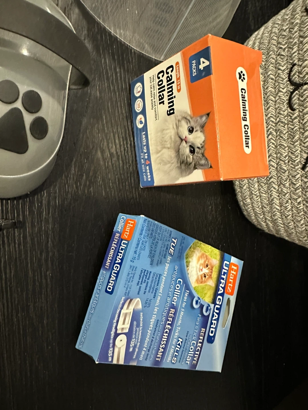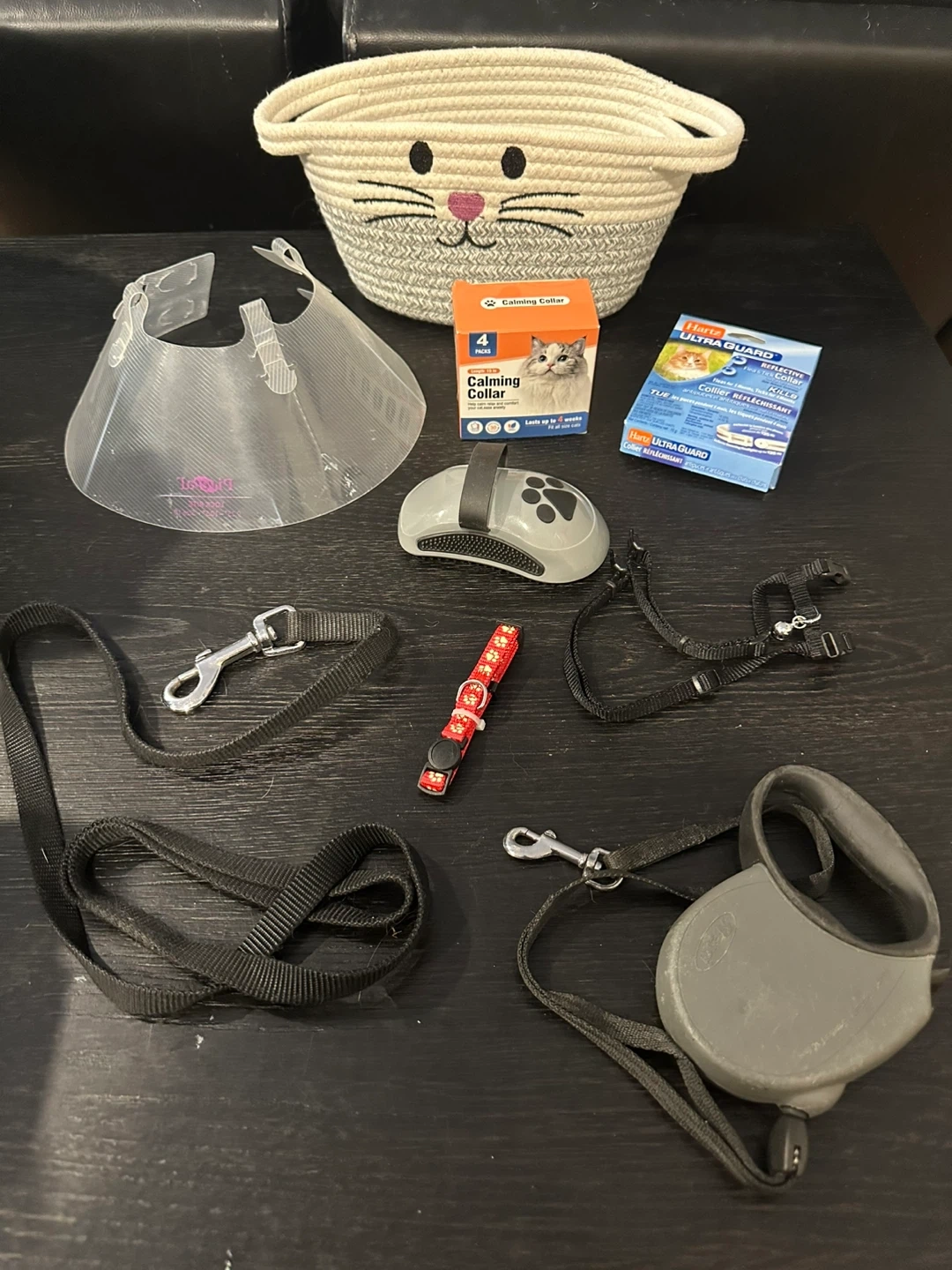 Selling a bundle of pet supplies! Includes a retractable leash, harness, calming collar (4-pack), reflective collar, and a grooming tool. Also includes a cute kitty basket!