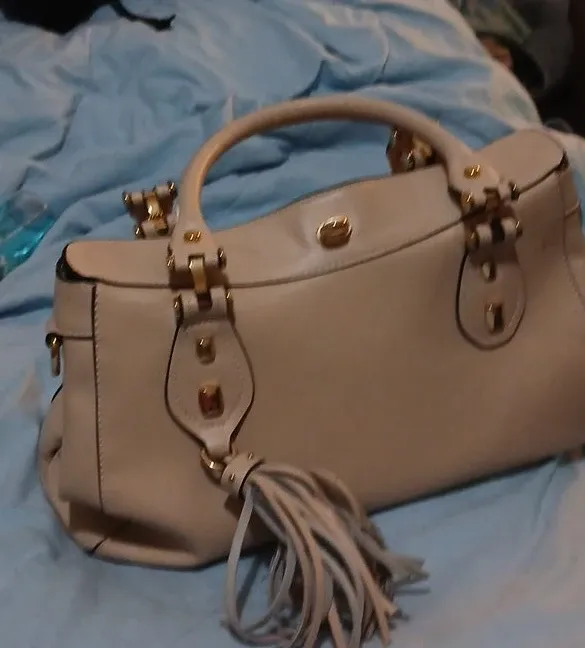 Light beige leather handbag with gold hardware and a tassel detail. It has a top handle and a structured shape. This bag would be great for everyday use.