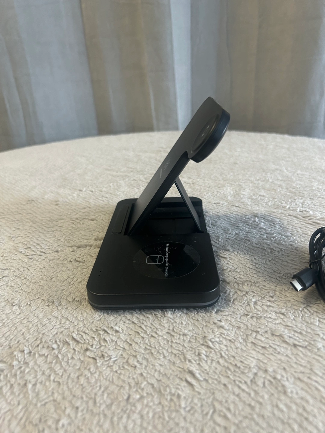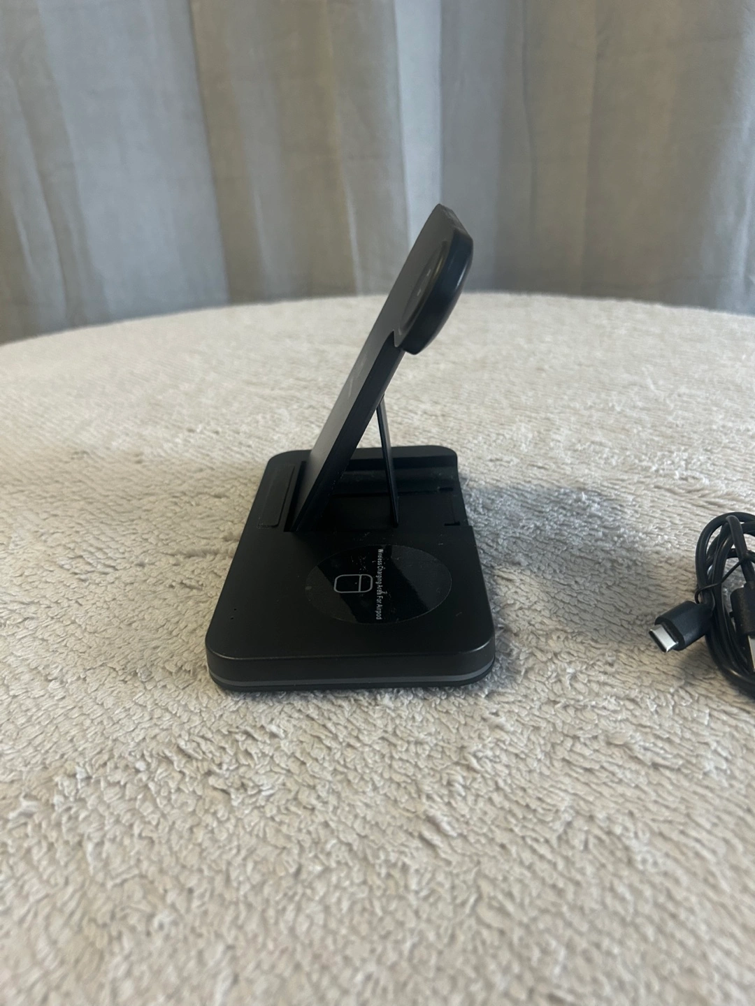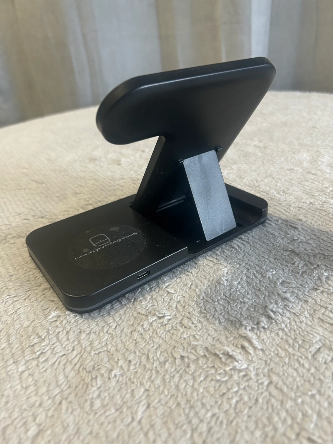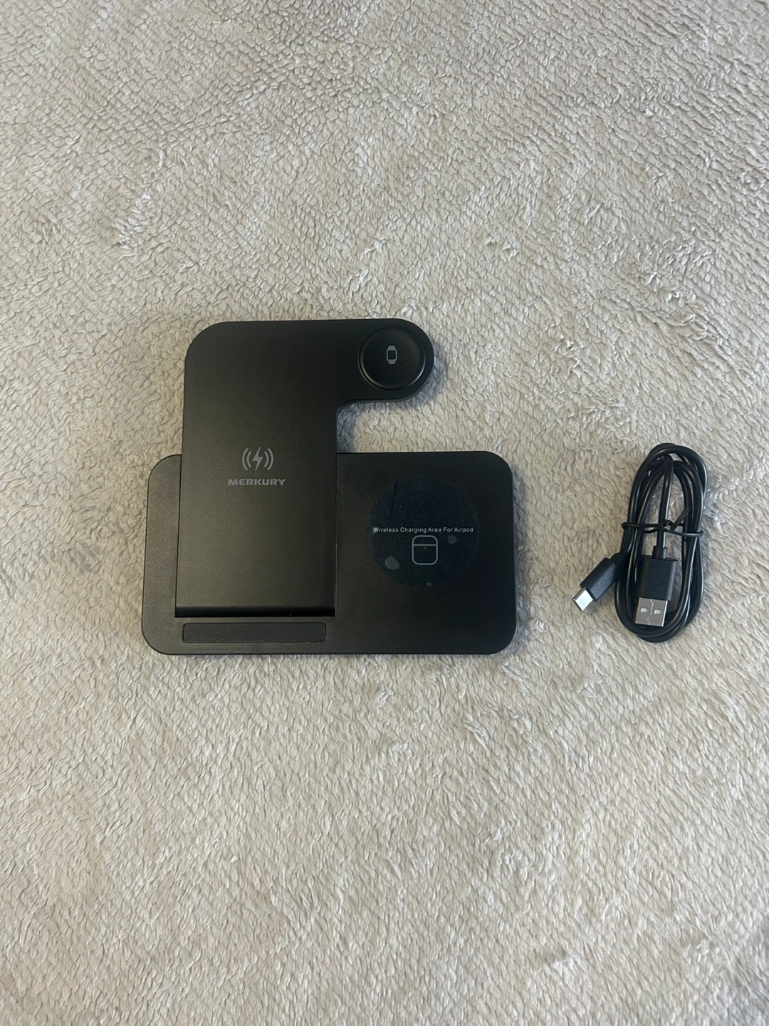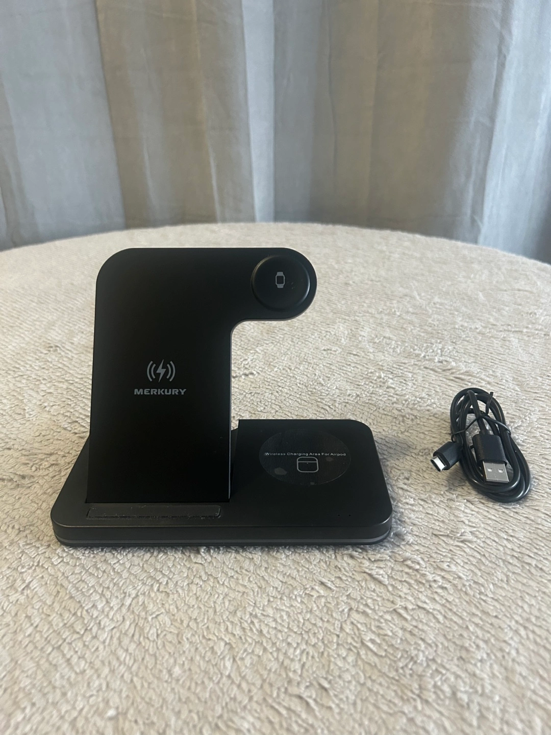 Three-in-one wireless charging station. Charges phones, AirPods, and Apple Watches simultaneously. Includes USB charging cable. Foldable stand.