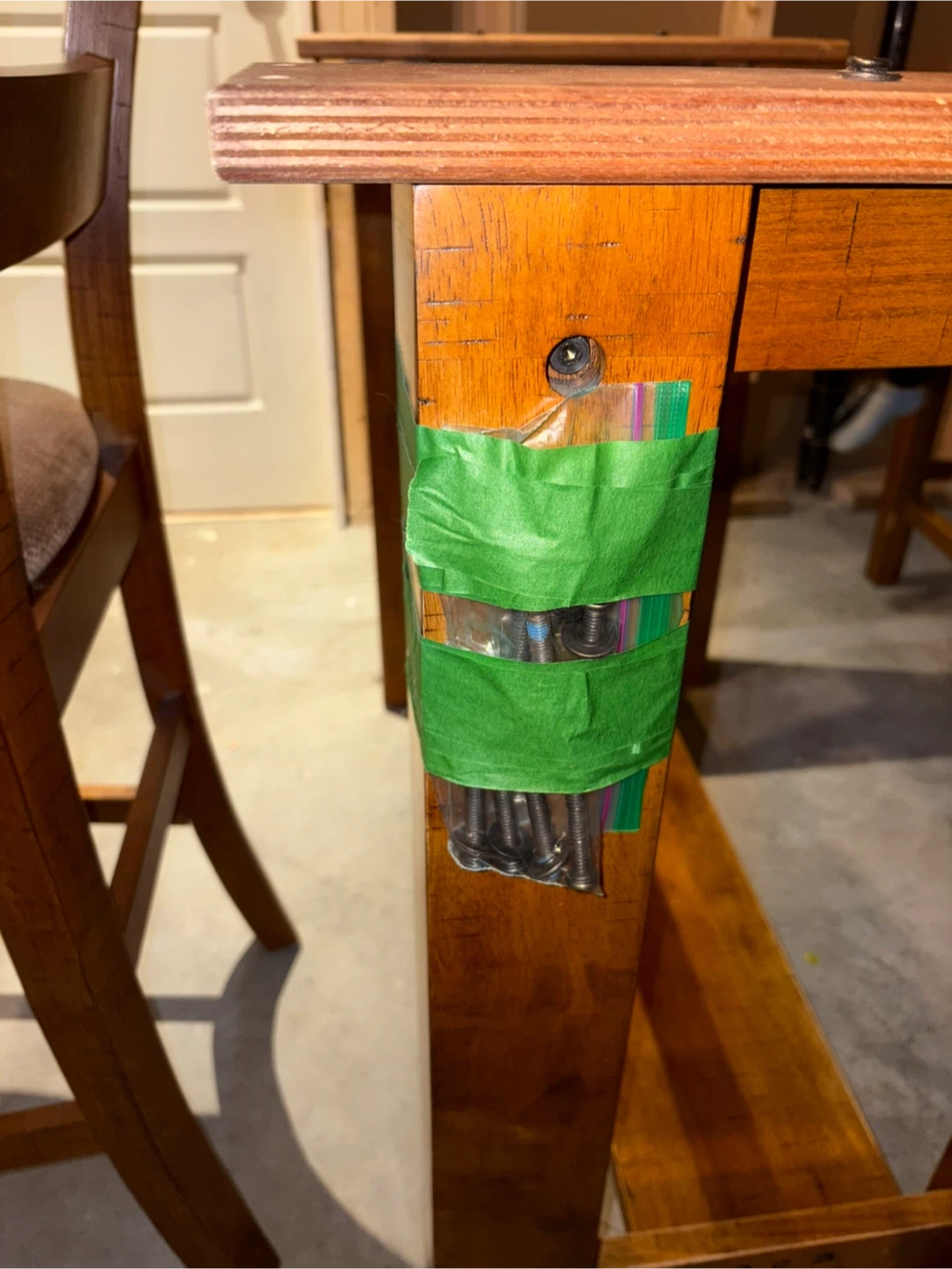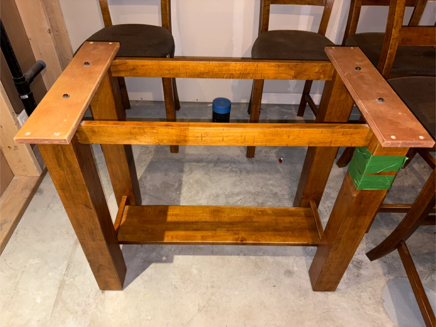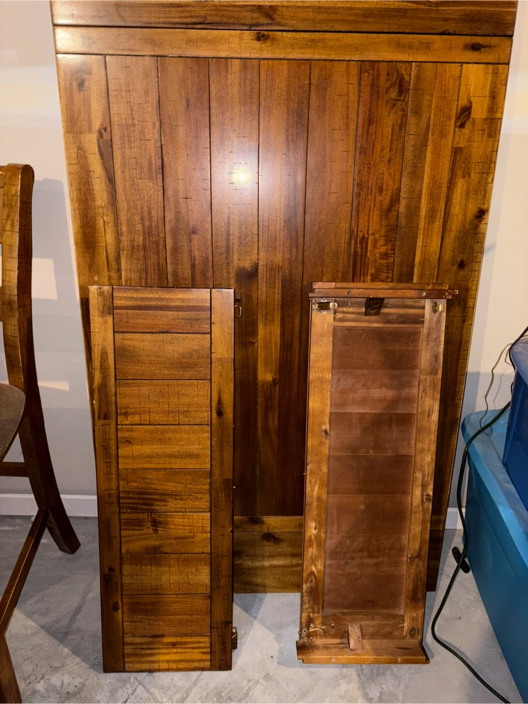 Solid wood table with a warm finish. Includes 2 table leaf inserts. Table has been in storage and is taken apart, all pieces to assemble are taped to the table leg.