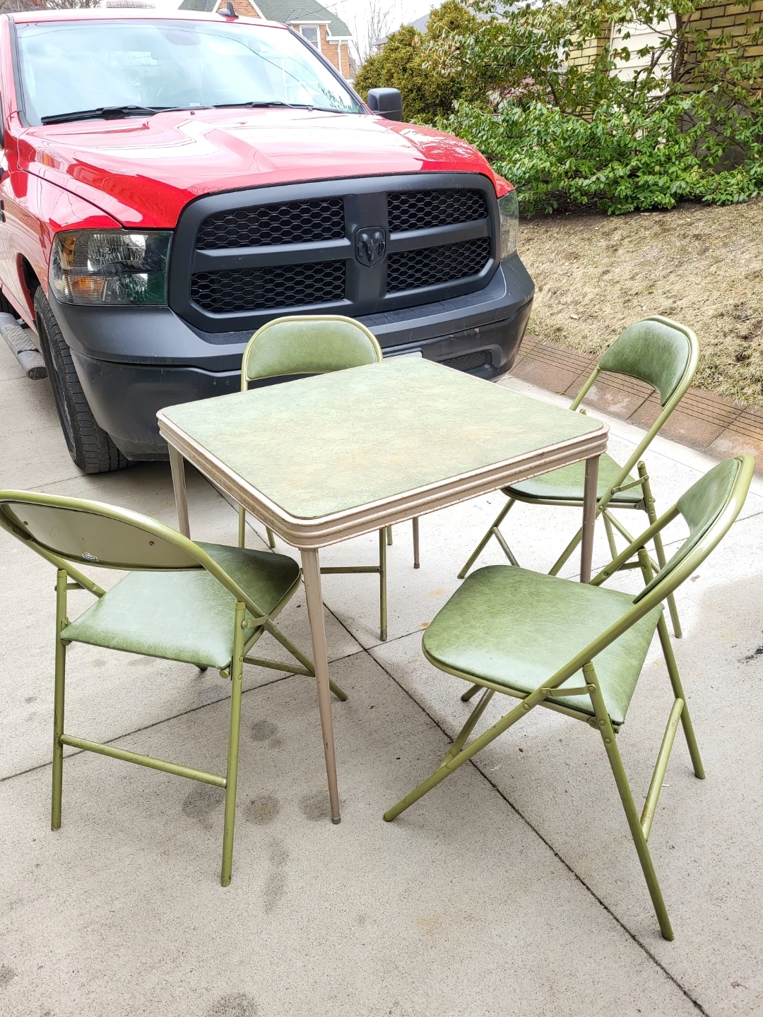A vintage folding card table and four matching chairs. The set is in a muted green colour with metal frames. It's perfect for game nights or extra seating when needed!