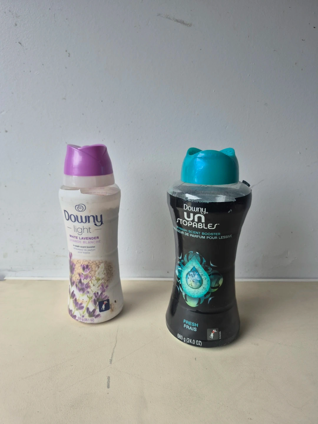 Two bottles of Downy scent boosters, one in White Lavender and the other in Fresh scent. The White Lavender bottle is 281 g (9.9 OZ) and the Fresh scent bottle is 680 g (24.0 OZ).
