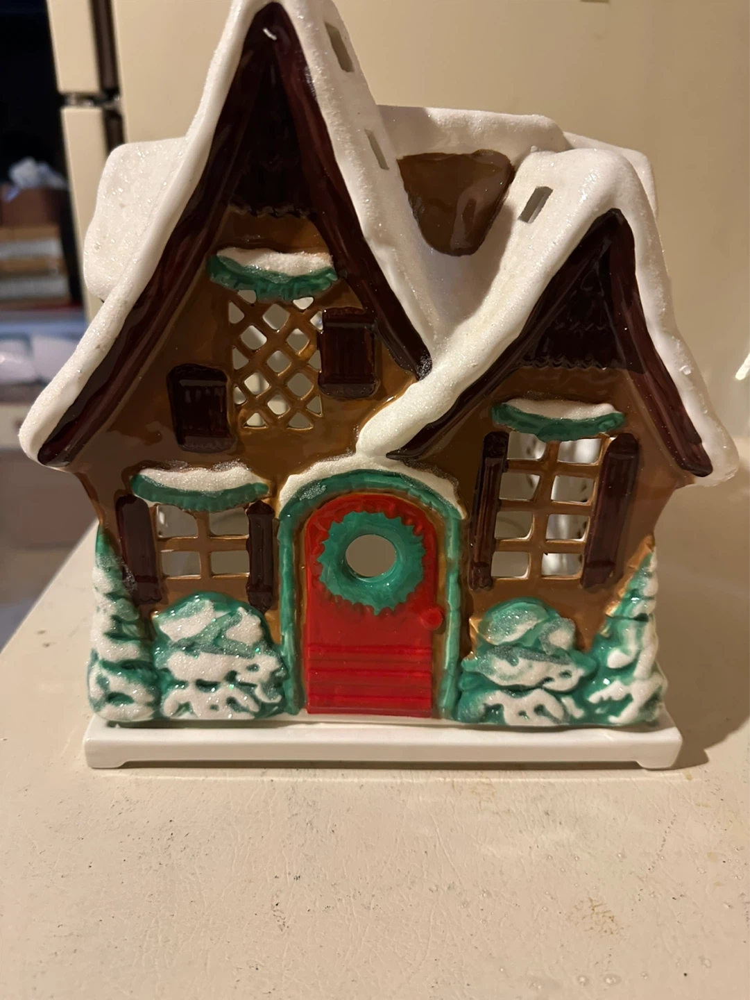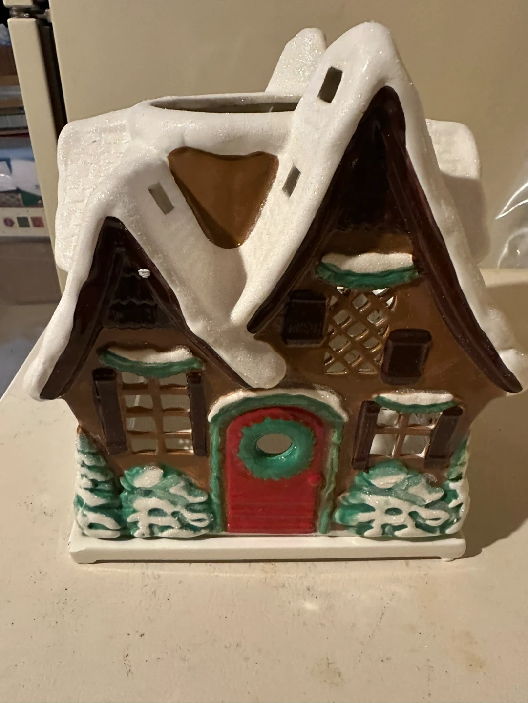 A festive PartyLite jar holder designed to look like a woodland cottage covered in snow. It features intricate details like trees and windows. It's perfect for adding a cozy, wintery touch to your home decor! Comes in original box