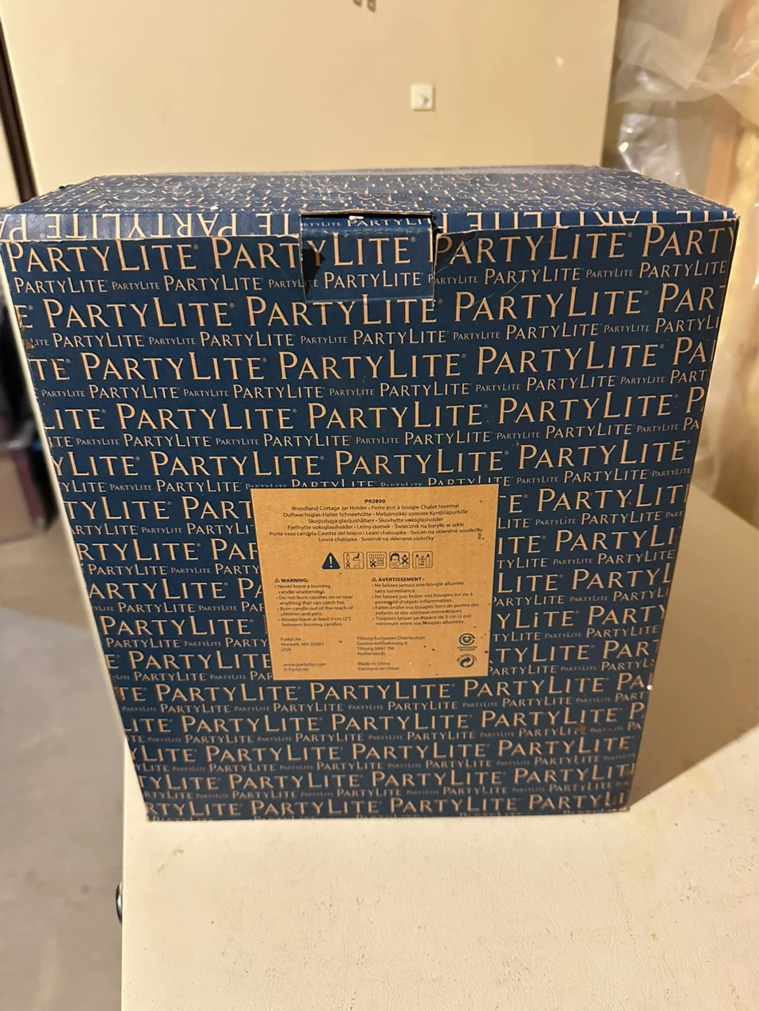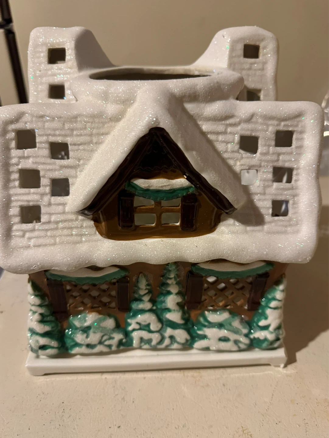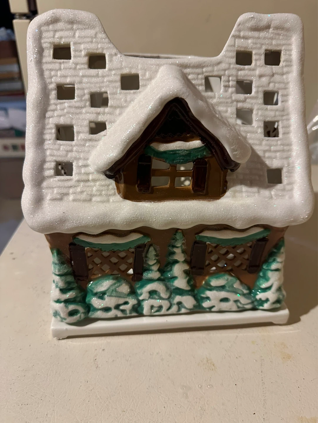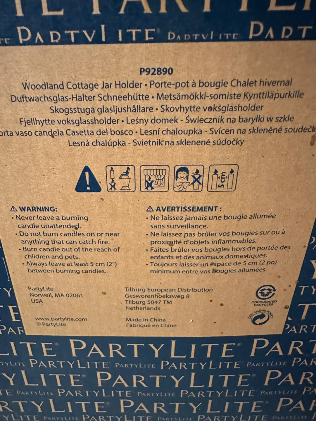 A festive PartyLite jar holder designed to look like a woodland cottage covered in snow. It features intricate details like trees and windows. It's perfect for adding a cozy, wintery touch to your home decor! Comes in original box