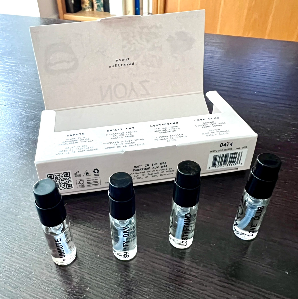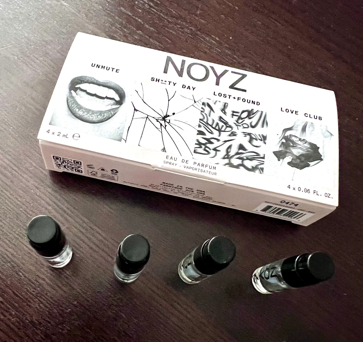 eau de parfum spray vials for every mood: Unmute, Love Club, Lost + Found, and Sh**ty Day. Sample one at a time, layer them up, or put one in every bag.