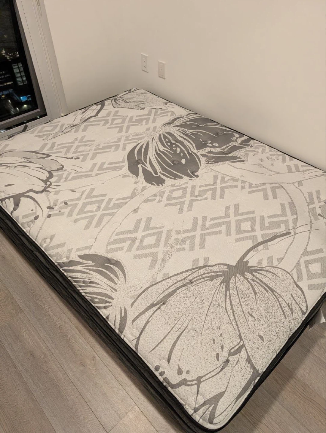 This mattress features a grey and white floral pattern. It's a standard mattress size. Good for any bedroom!