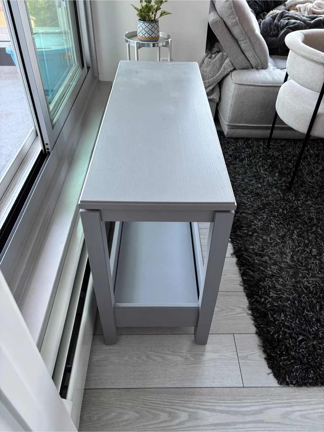 Selling a console table in great condition! It's a lovely grey colour and would work well in an entryway or living room. It also has a shelf at the bottom for extra storage.