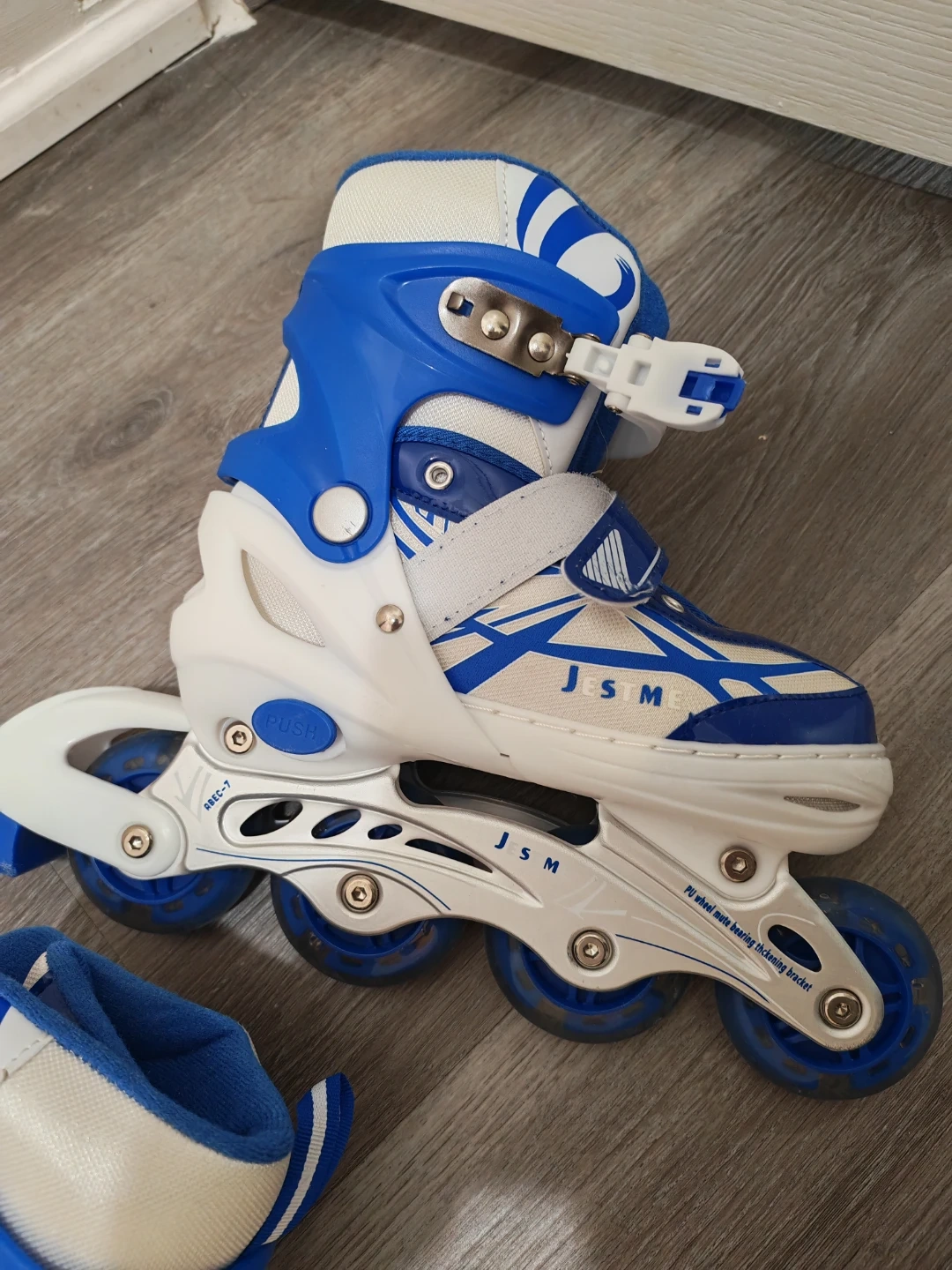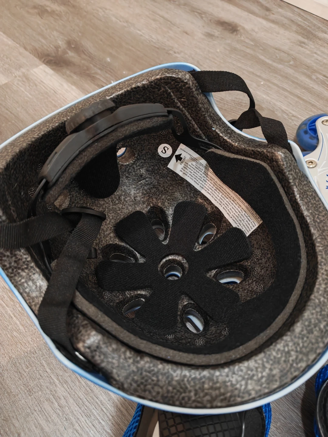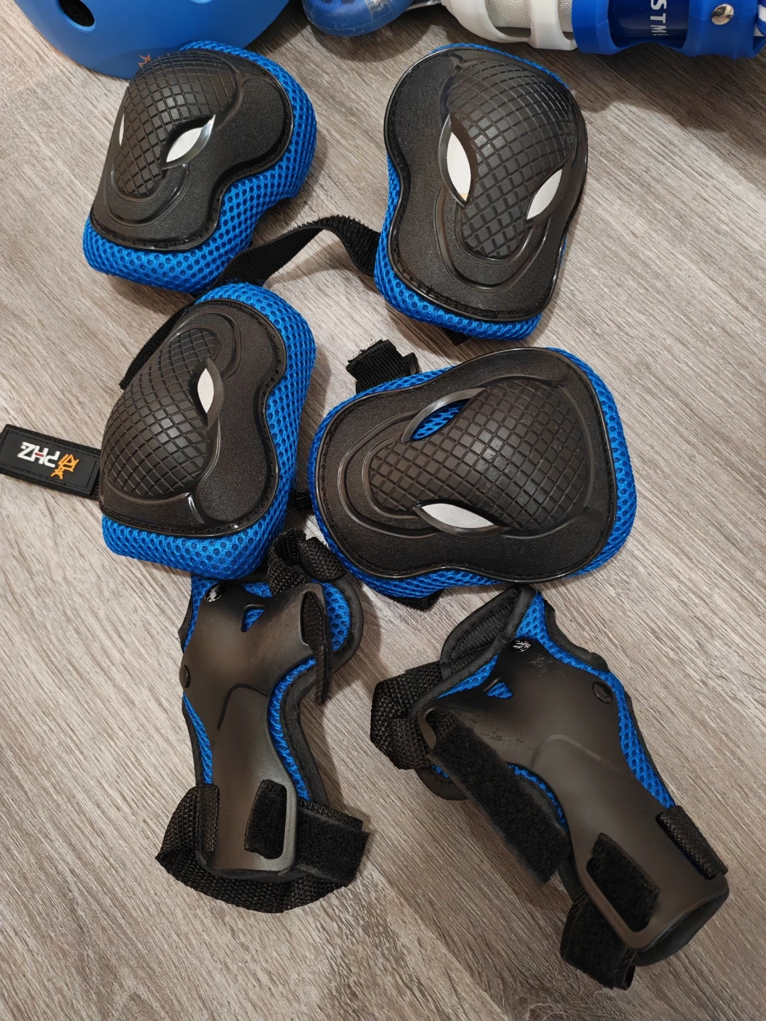 This set includes adjustable rollerblades and a blue safety helmet. Protective gear for knees, elbows, and wrists is also included. The helmet is size S. Great for young skaters learning new skills! Only used twice, like new.