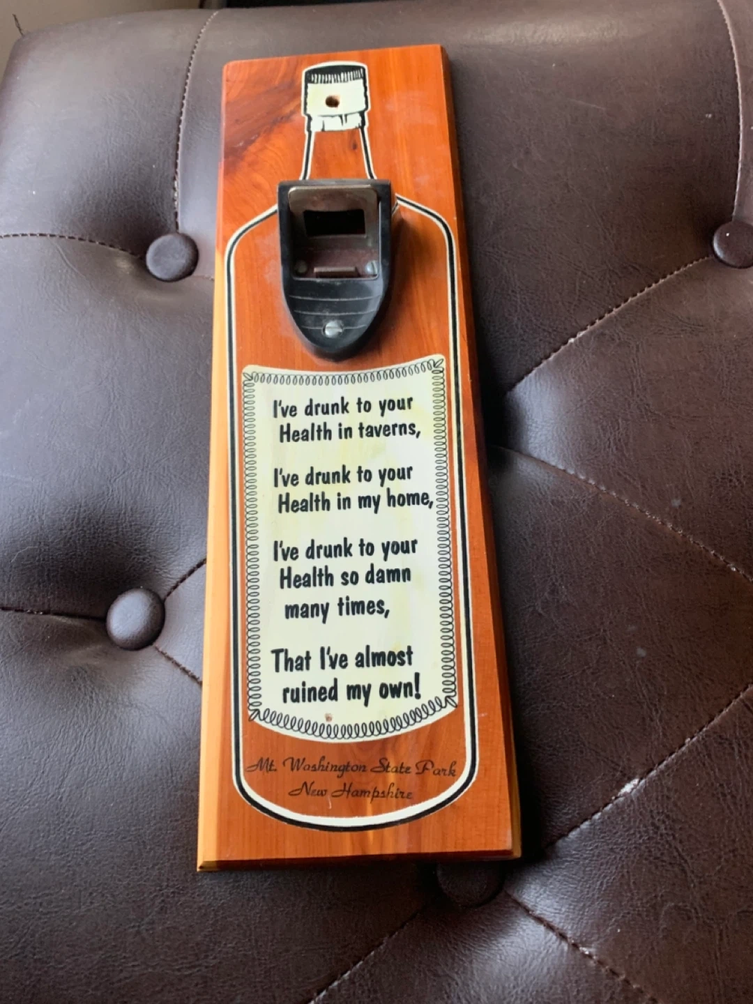 Here's a wooden bottle opener from Mt. Washington State Park in New Hampshire! It has a funny quote about drinking to your health. A great addition to any home bar or kitchen