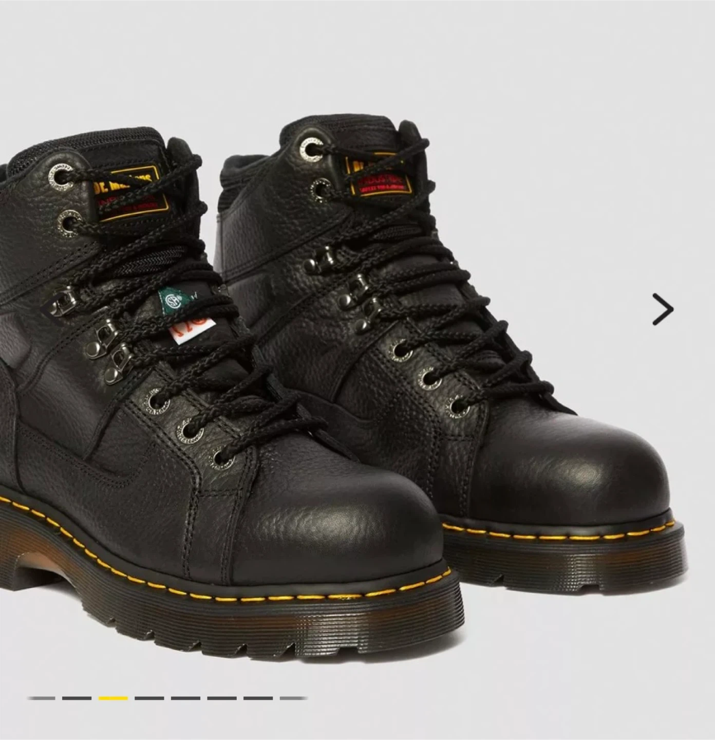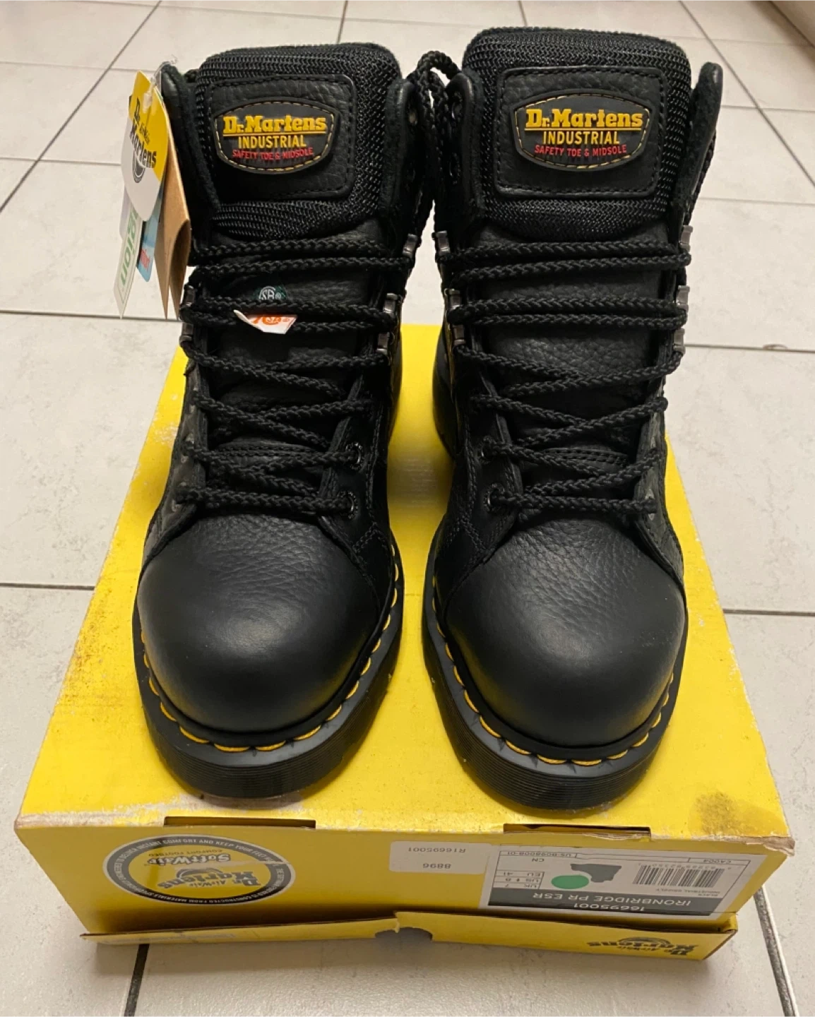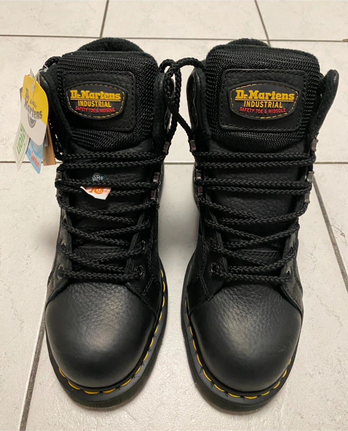 Dr. Martens Industrial work boots with safety toe and midsole. These black boots are made with durable leather and have a classic yellow welt stitch. They come in the original box.