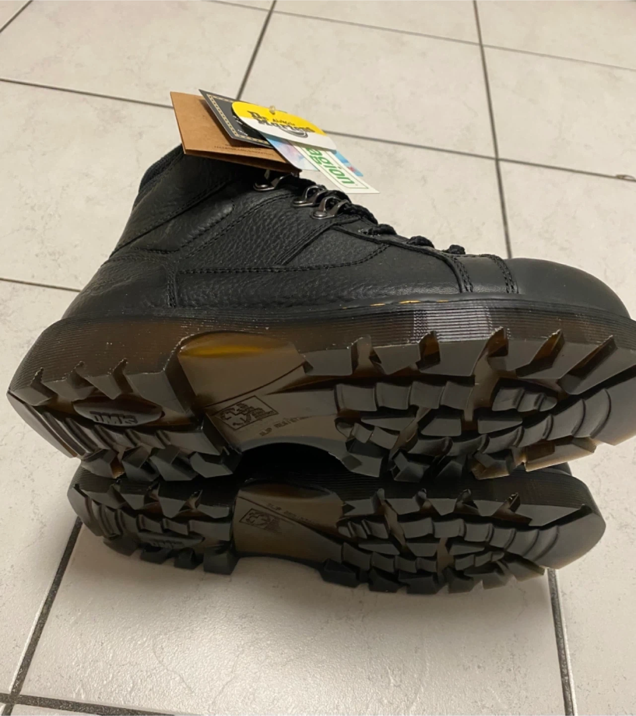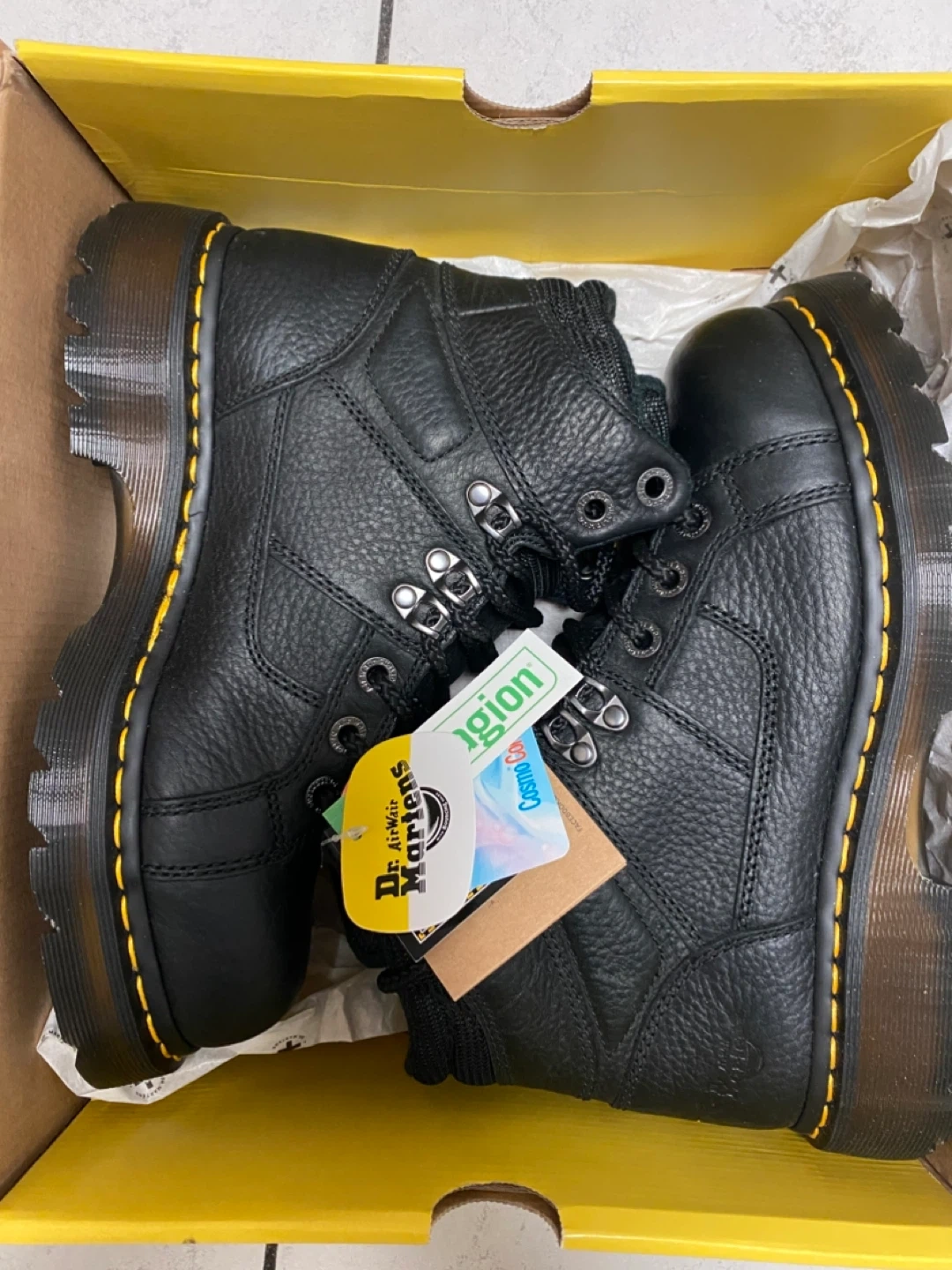 Dr. Martens Industrial work boots with safety toe and midsole. These black boots are made with durable leather and have a classic yellow welt stitch. They come in the original box.