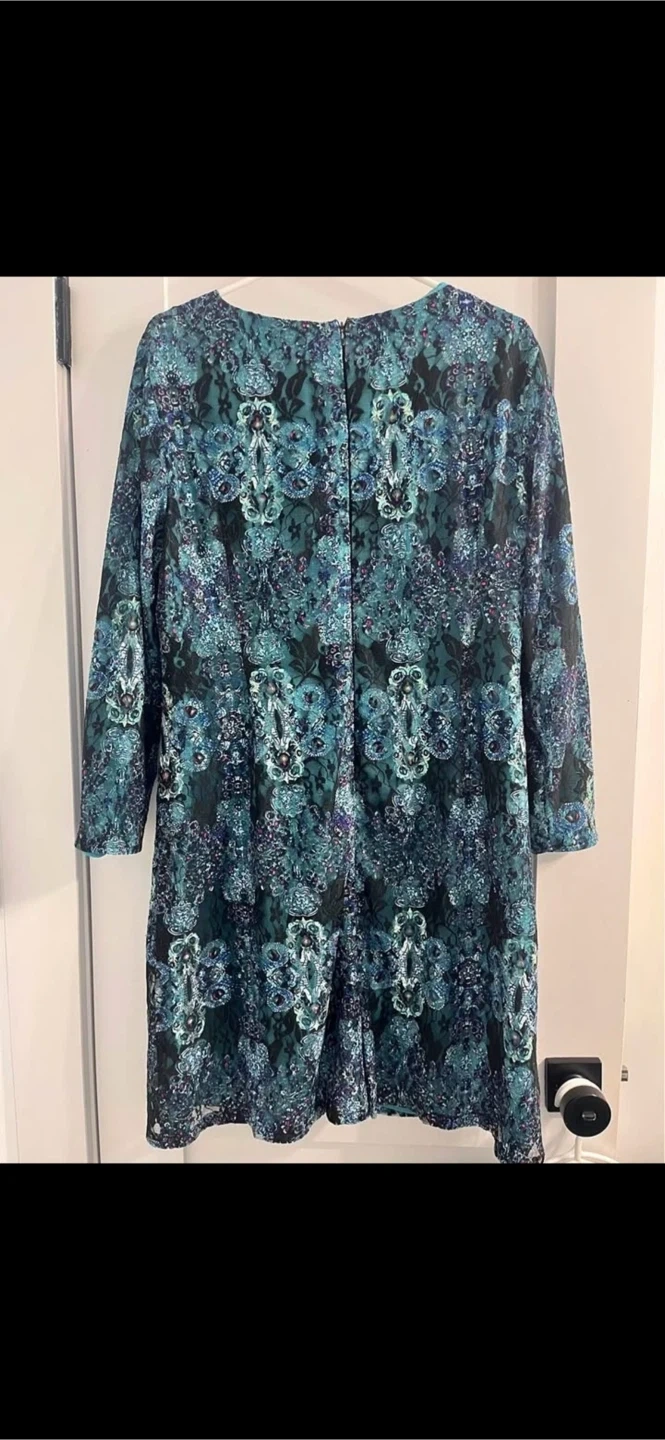 This is a women's long sleeve dress featuring a vibrant teal and blue floral pattern. It has a round neckline and a back zipper closure. The dress is made of a textured fabric.