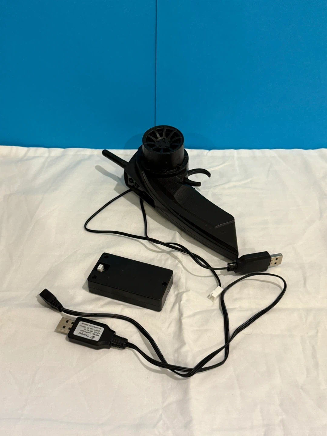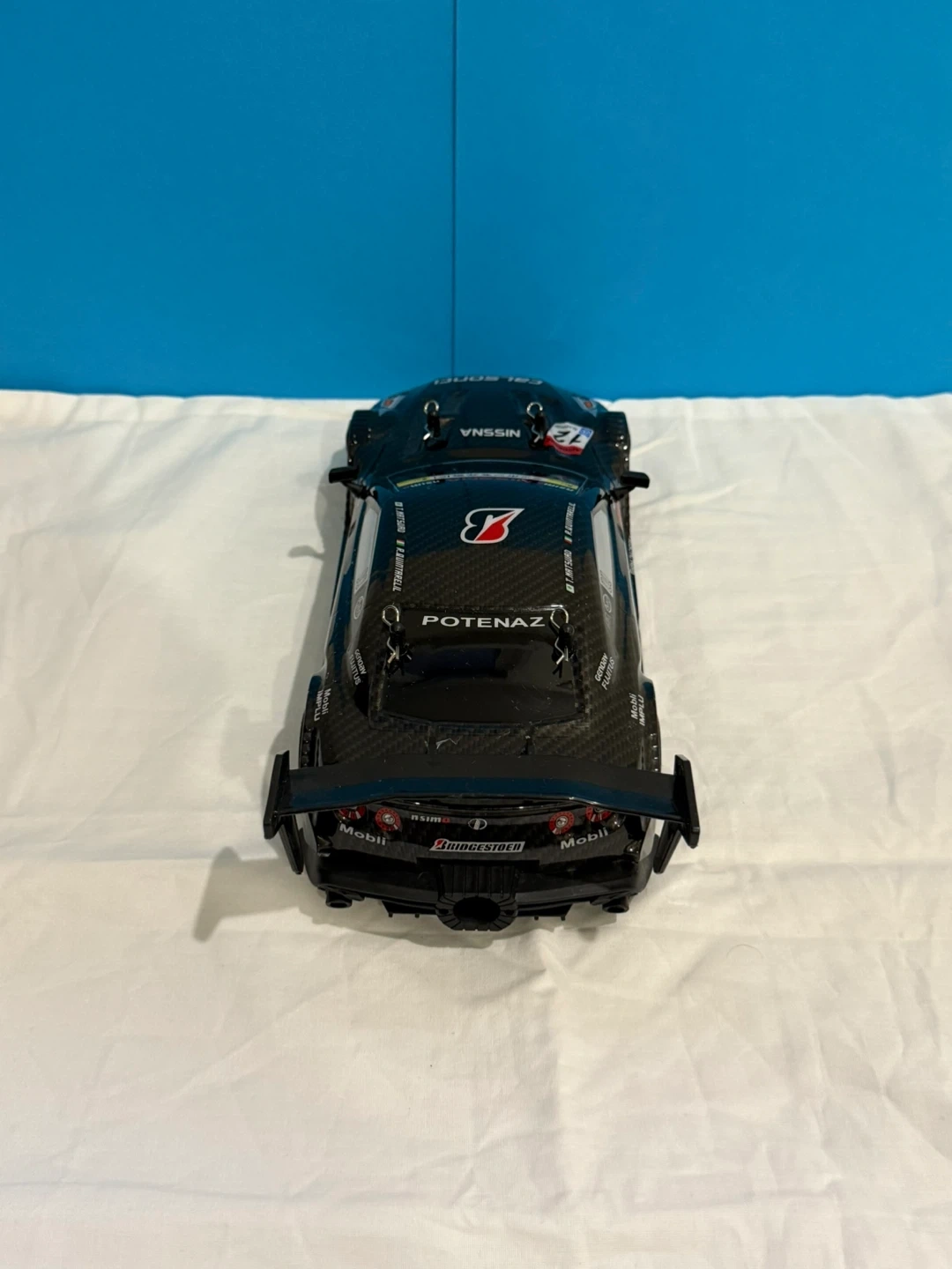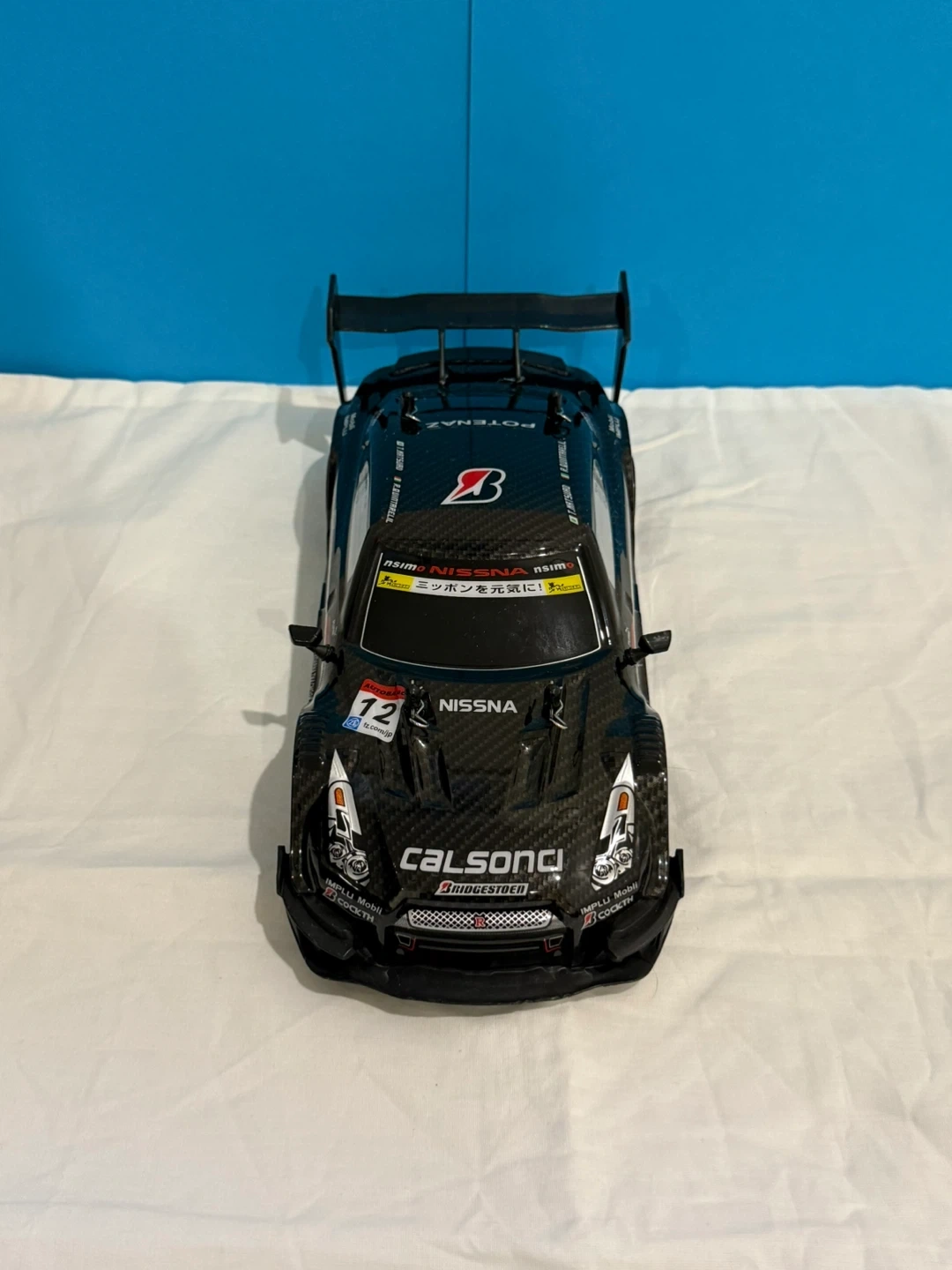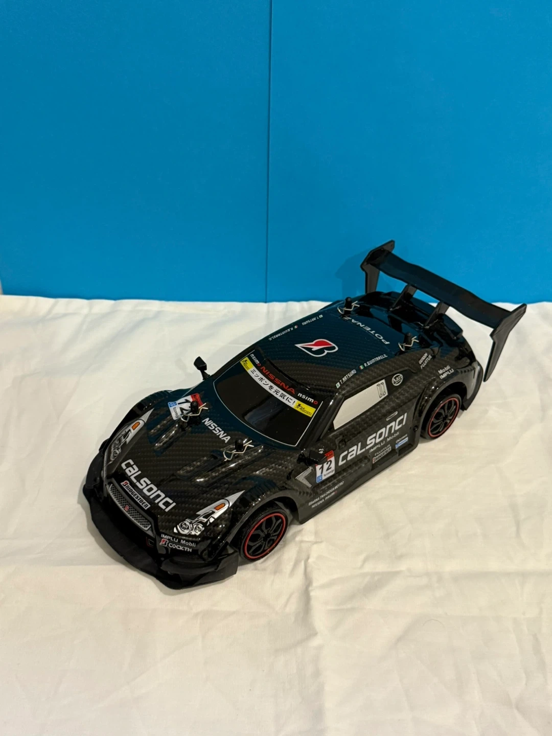 Black remote, RC car with racing decals (Nissan GTR) . Includes a remote controller, 2 chargers, 2 batteries with front, back and bottom colourful LED lights for riding in the dark. It is built to drift around the house or anywhere else.