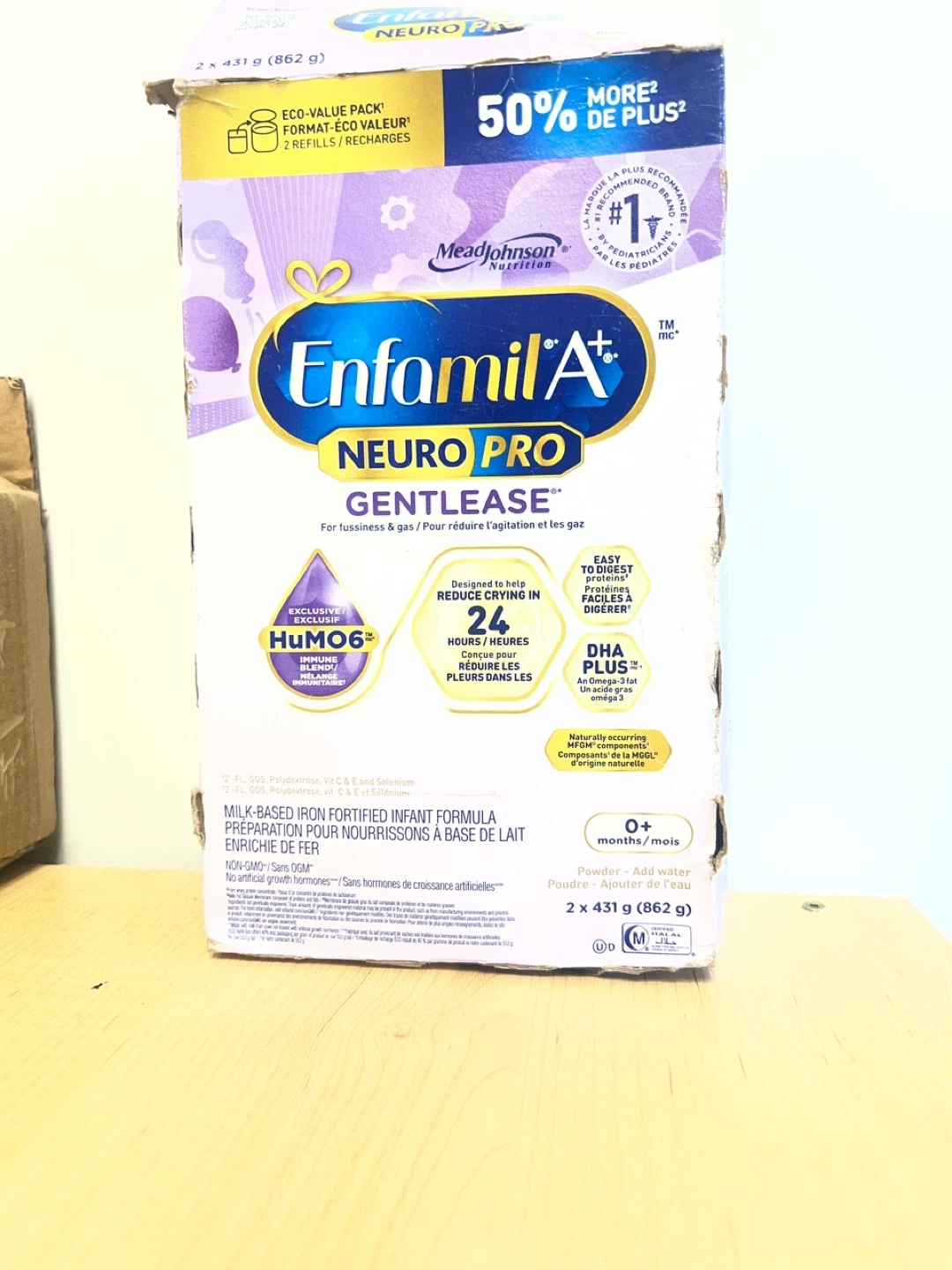 Selling a box of Enfamil A+ NeuroPro Gentlease infant formula. It's designed to help reduce crying in 24 hours and is easy to digest. The formula also contains DHA, naturally occurring components of breast milk.
