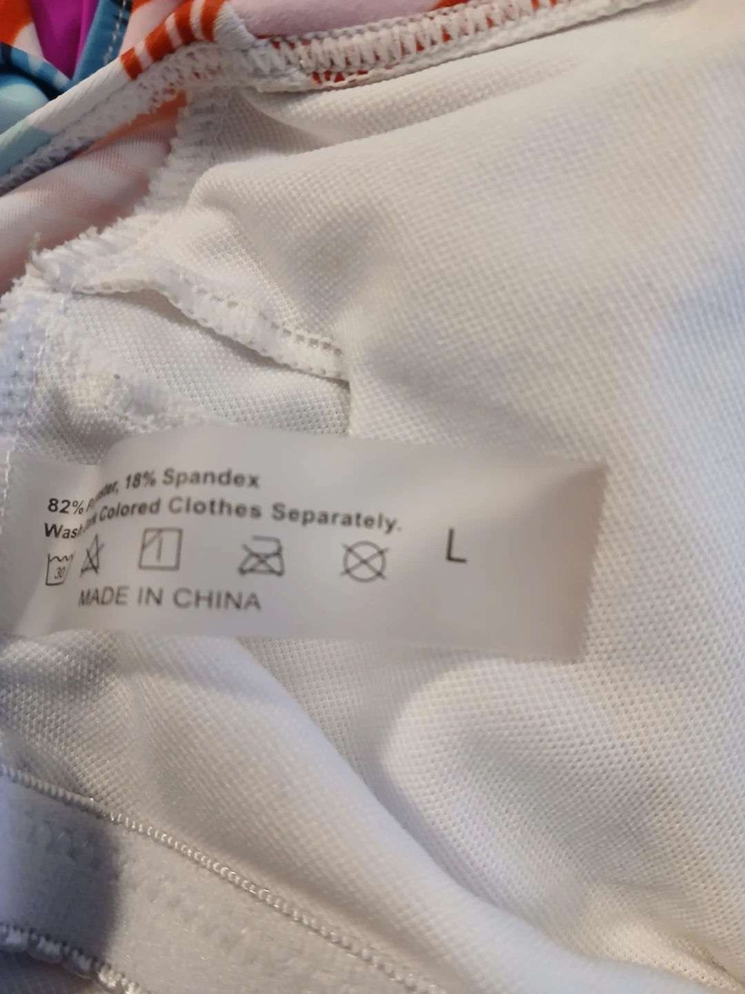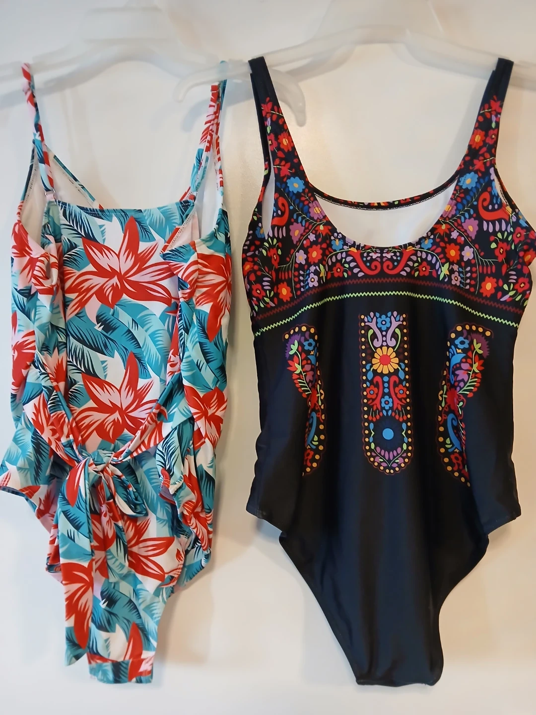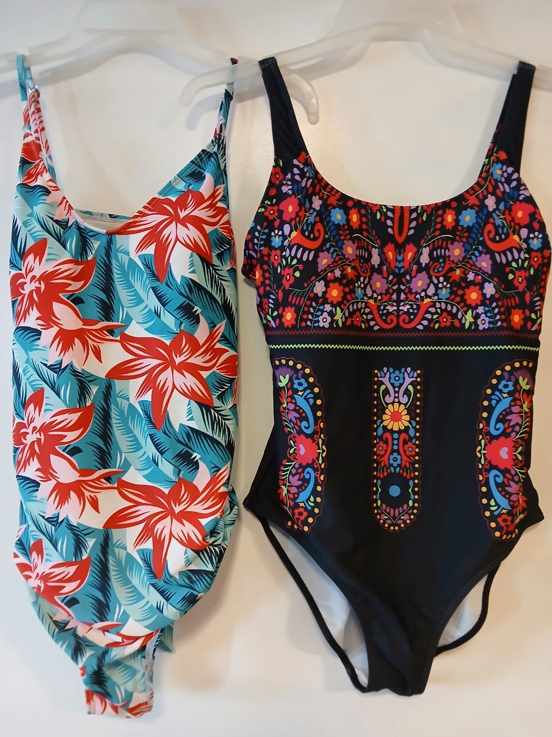 Selling two women's one-piece swimsuits. Both are size L and made of 82% Polyester and 18% Spandex. One features a tropical floral print, and the other has a black background with a colourful folk art design. They're ready for summer fun!