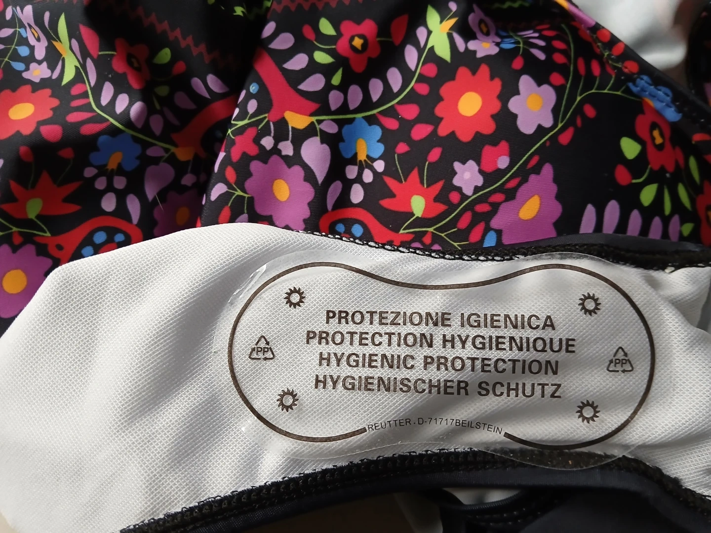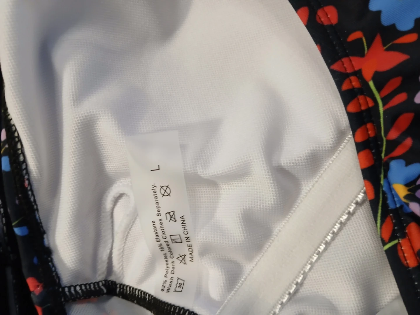 Selling two women's one-piece swimsuits. Both are size L and made of 82% Polyester and 18% Spandex. One features a tropical floral print, and the other has a black background with a colourful folk art design. They're ready for summer fun!