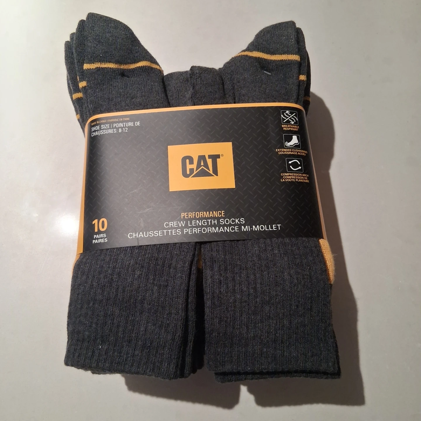 Here's a pack of CAT Performance crew length socks! These socks are size 8-12 and come with 10 pairs. They're designed to be breathable and have extended cushioning for extra comfort. Plus, they have compression arch support