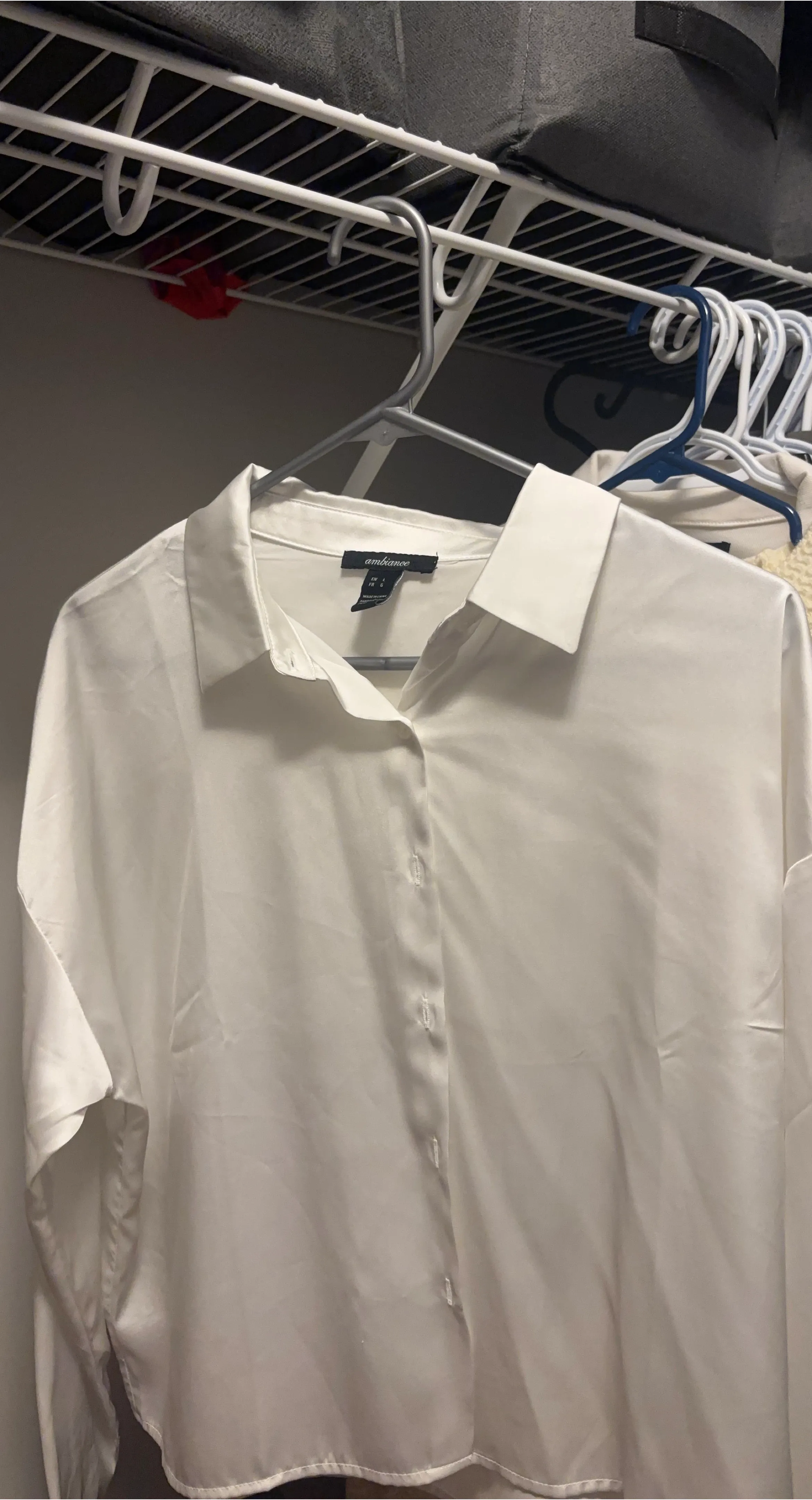 A classic white button-up shirt from Ambiance. It's a size L. This shirt offers a polished look.