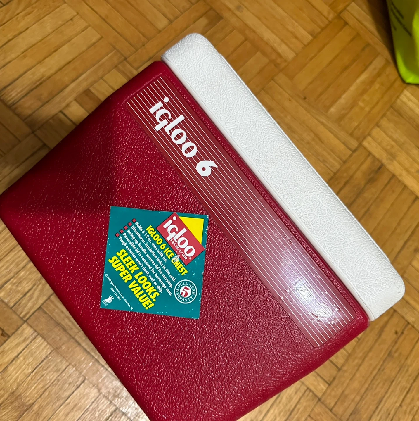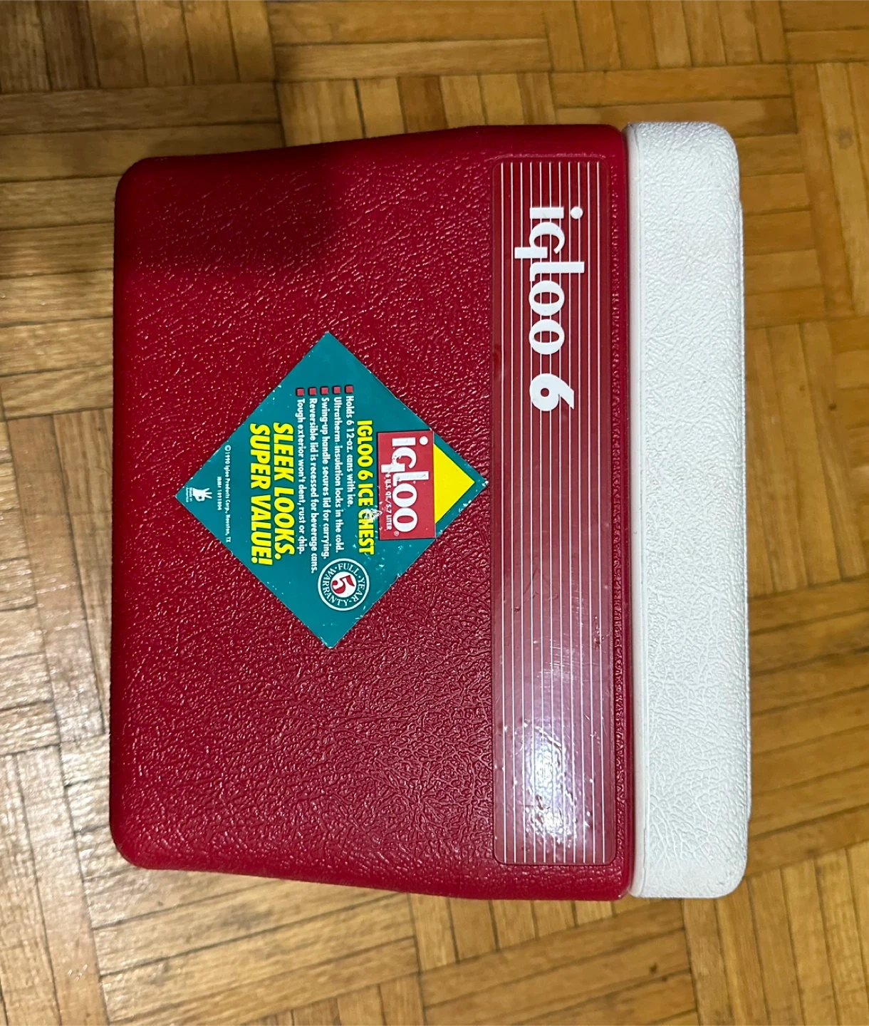 This is an Igloo 6 ice chest cooler in red. It's made of plastic with a white lid. Holds 6 cans with ice.