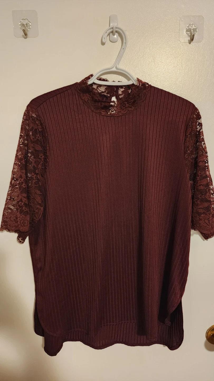 Buy & SellBurgundy Ribbed Lace Sleeve TopBurgundy Ribbed Lace Sleeve Top$7This YAS top features a burgundy ribbed body with lace sleeves and mock neck. It's a size XL. Just tried on.ConditionLike newSizeXLWHERE TO MEETPatterson stationView MapSELLERSOMetrotown150 reviews0 chats·0 favorites·4 viewsSEND CHAT TO SELLERHi SO! I’m interested in your listing.Hi SO! I’m interested in your listing.Get the Karrot app to chatSign In to chat