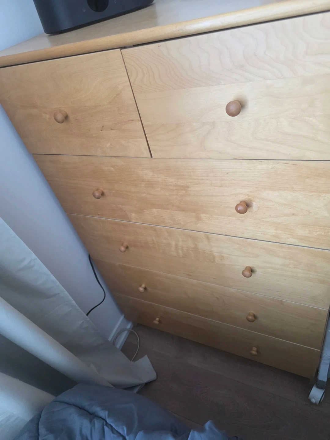 This dresser has seven drawers for storage. It's made of light-coloured wood. Perfect for keeping clothes tidy!