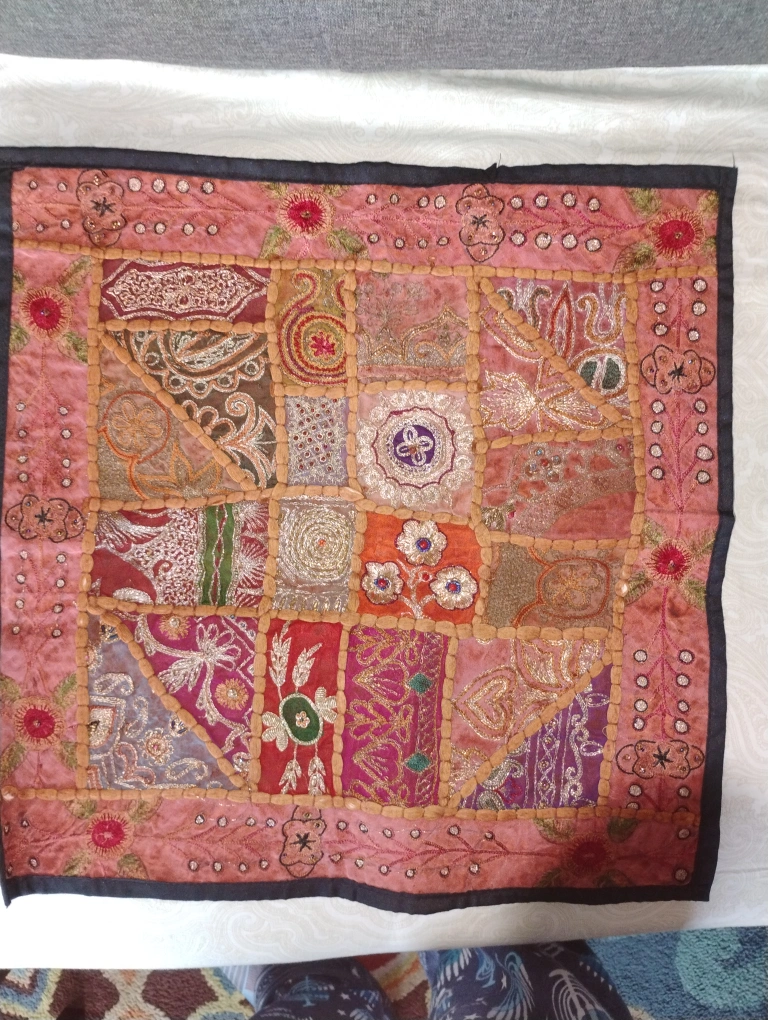 Unique patchwork pillow cover with intricate embroidery and vibrant colours! It would look great in any room of the house