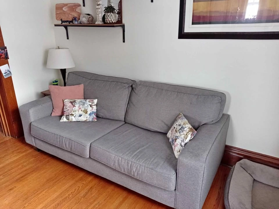 Gray three-seater couch and loveseat for sale. In good condition. Covers from bottom cushions are removable for easy cleaning. Pet friendly home. Throw pillows not included. There is some ripping of the fabric at the bottom of the couch but it's not visible and does not affect function. $300 for both or make an offer for one. Pick up only in East Galt.
