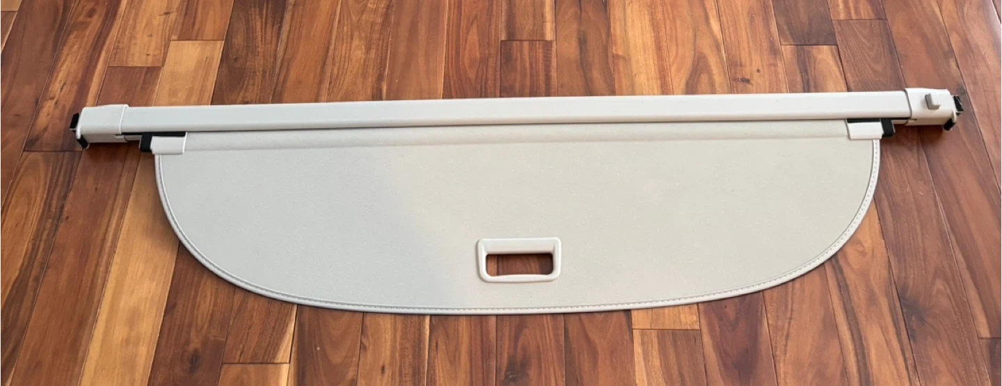 This is a beige retractable cargo cover for a vehicle. It's made of durable material and extends to cover the trunk area. Includes a handle for easy retraction. I have two in stock