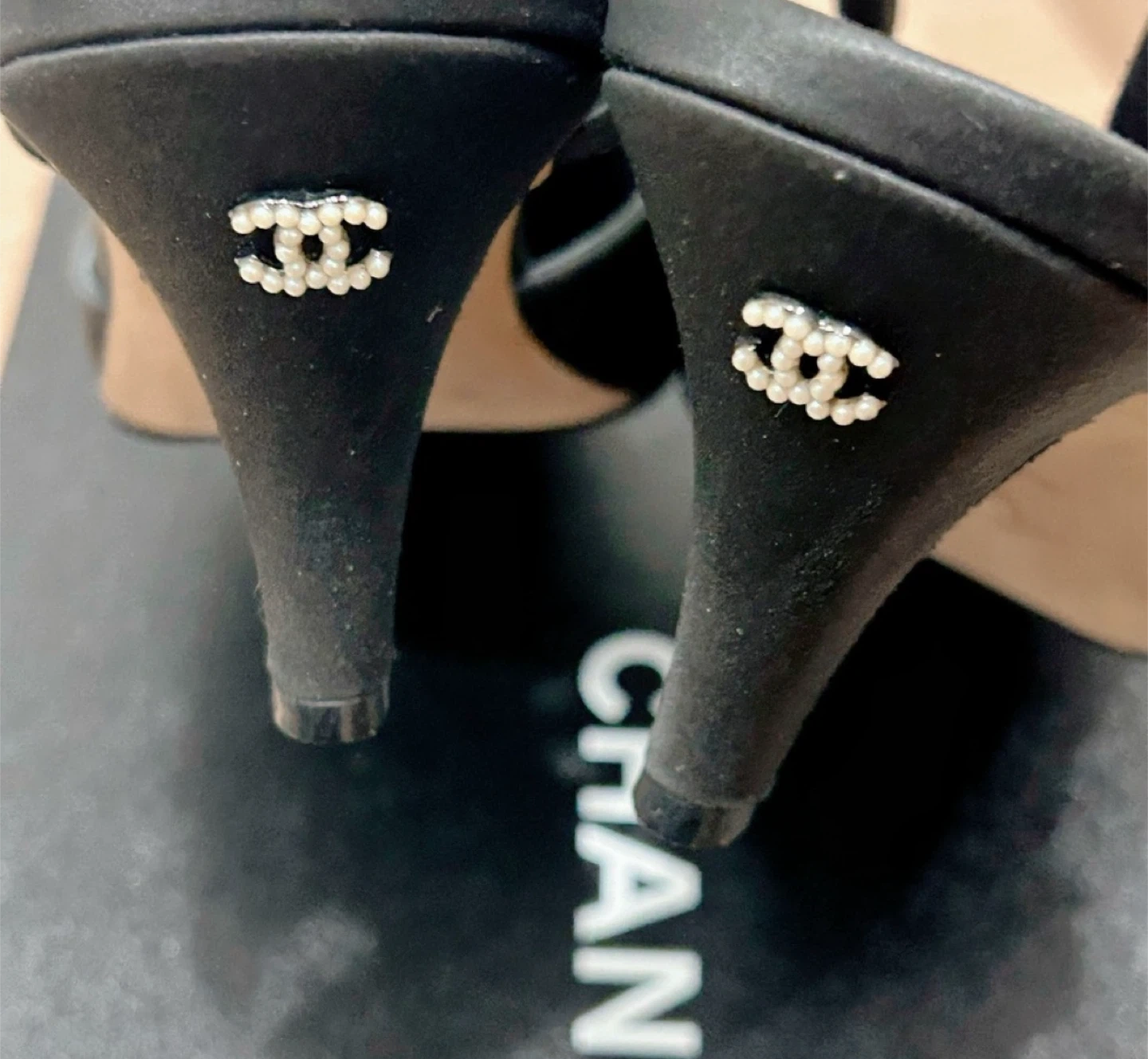 🧡black satin material, pearl-decorated strap. Stiletto heel, Chanel logo on the heel, stylish and versatile.