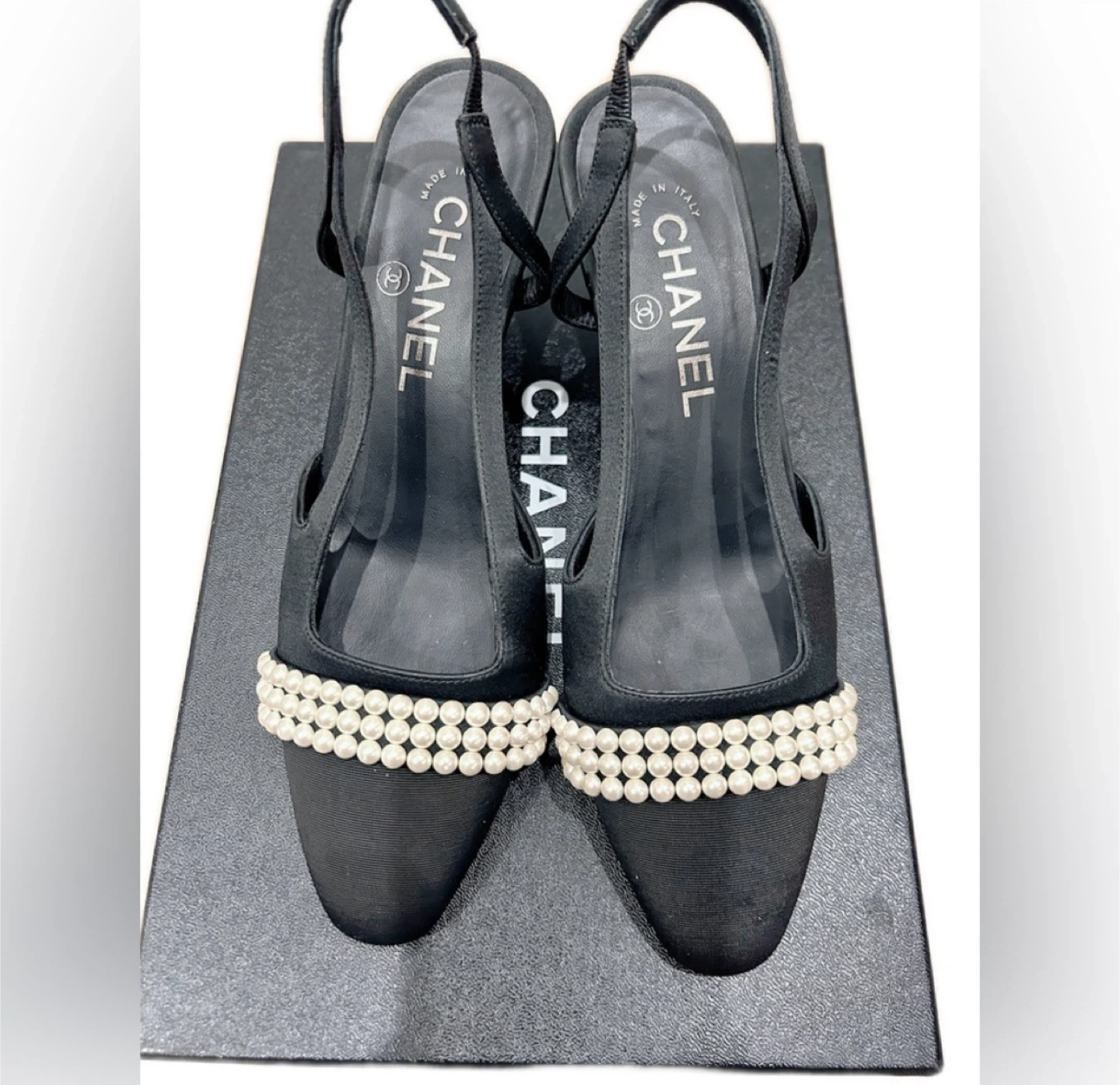 Classic Chanel slingback heels in black fabric. These shoes are adorned with elegant pearl detailing across the toe strap. They're made in Italy and feature the iconic Chanel logo on the heel. Includes original box. Size 36.5.
