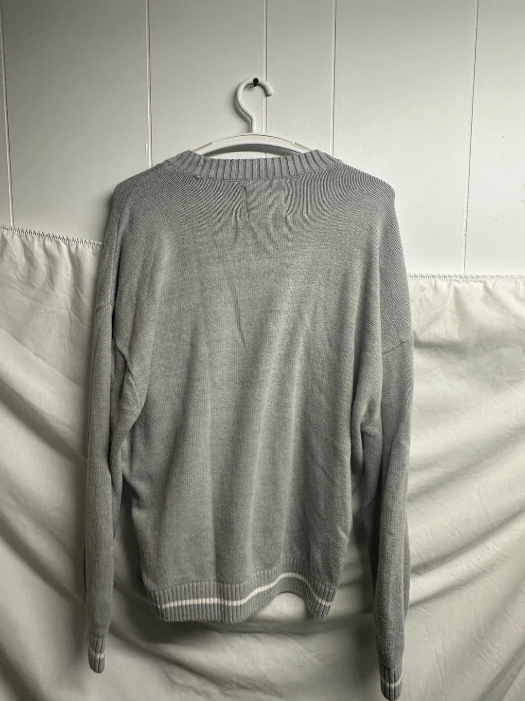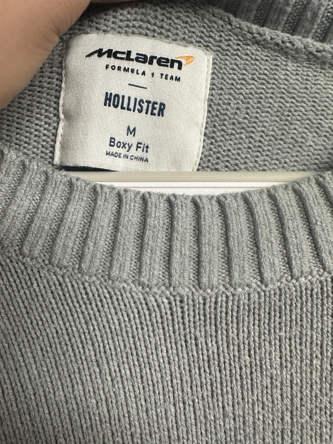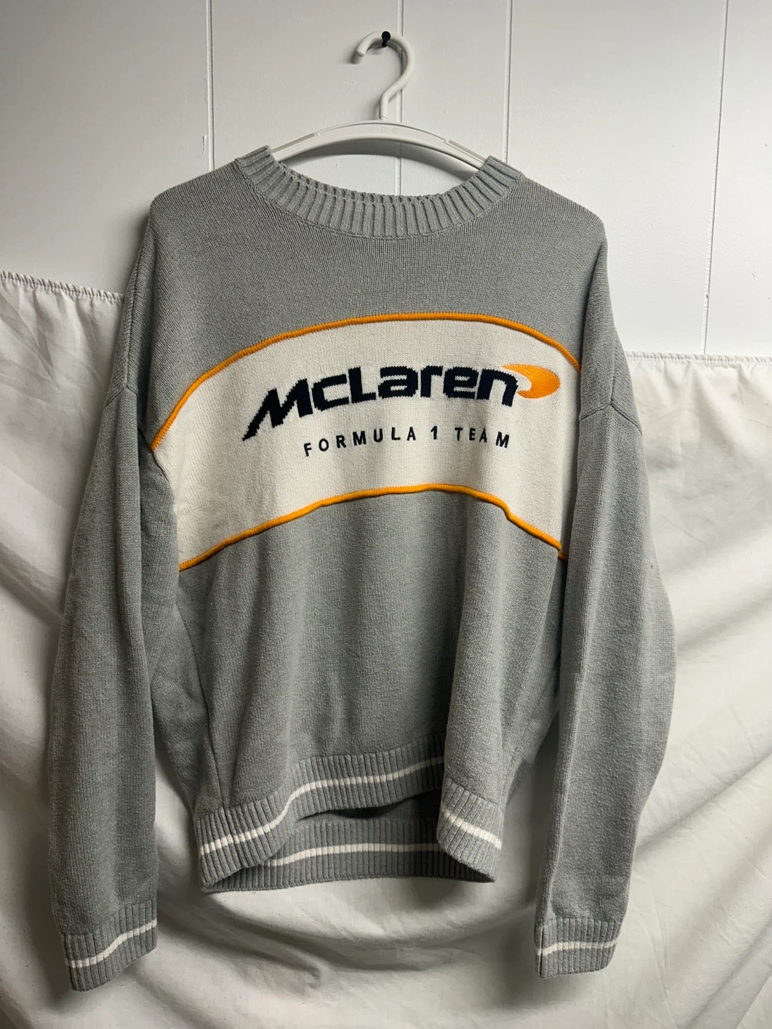 Selling a Hollister McLaren Formula 1 Team sweater in size medium. It's a boxy fit and made of a comfortable material. The sweater is grey with white and orange accents. Perfect for any McLaren fan!