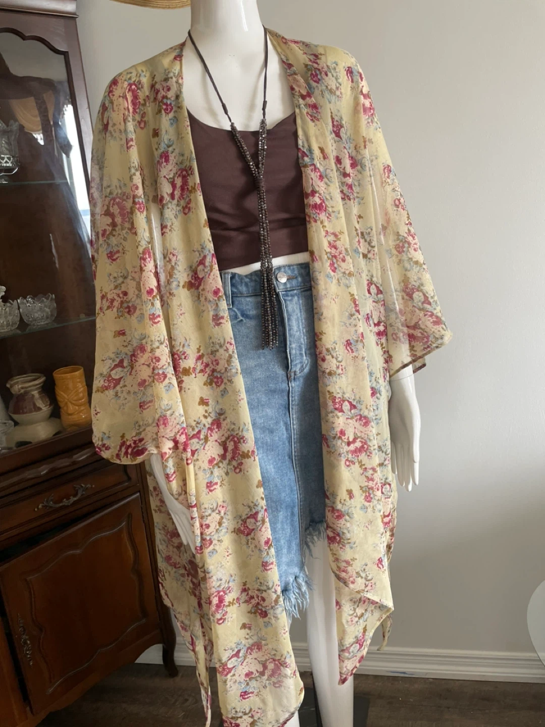 Lightweight sheer kimono featuring a yellow base with a pink and blue floral print. It's a breezy layering piece perfect for warmer weather. Ideal for adding a touch of style over a tank top or dress.