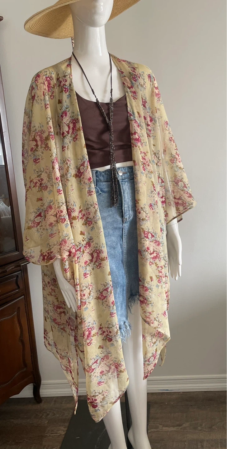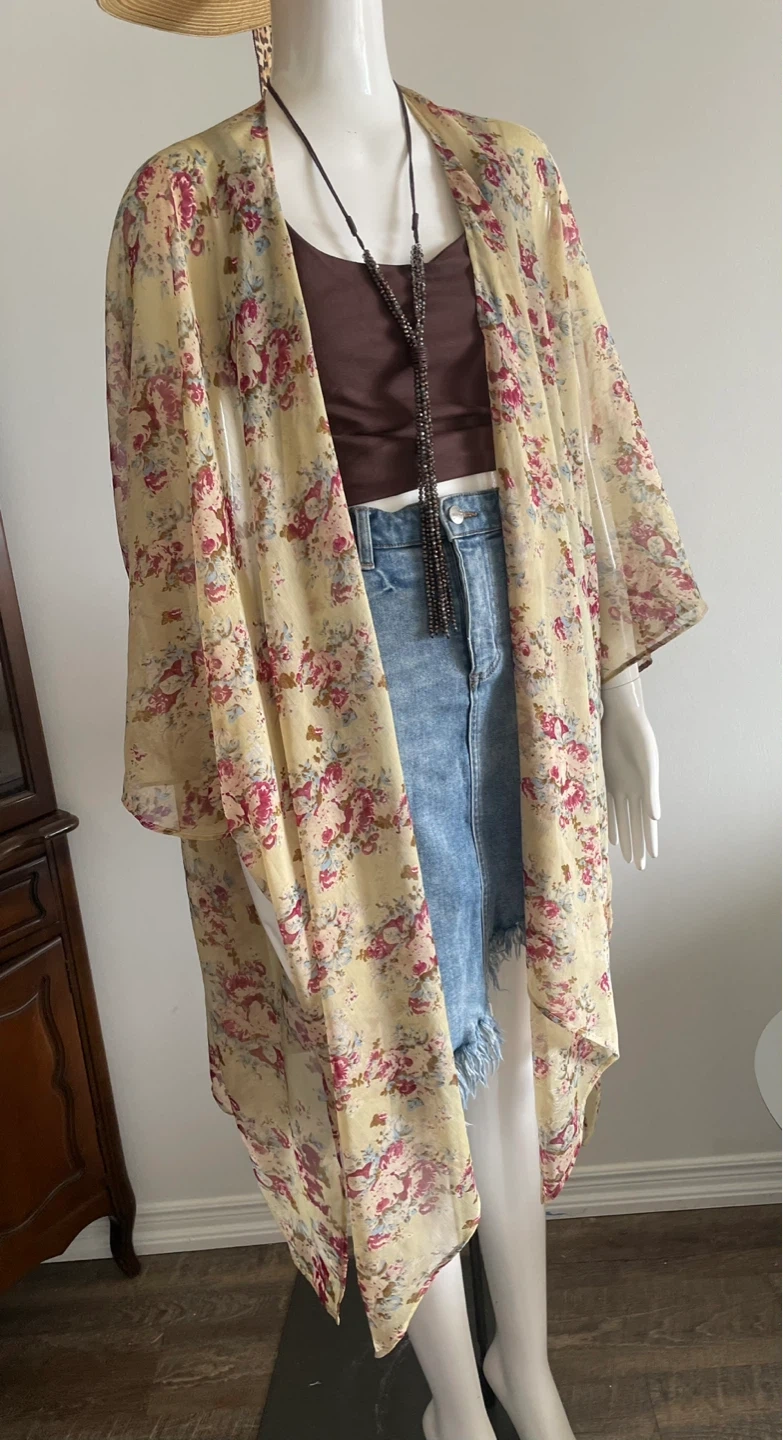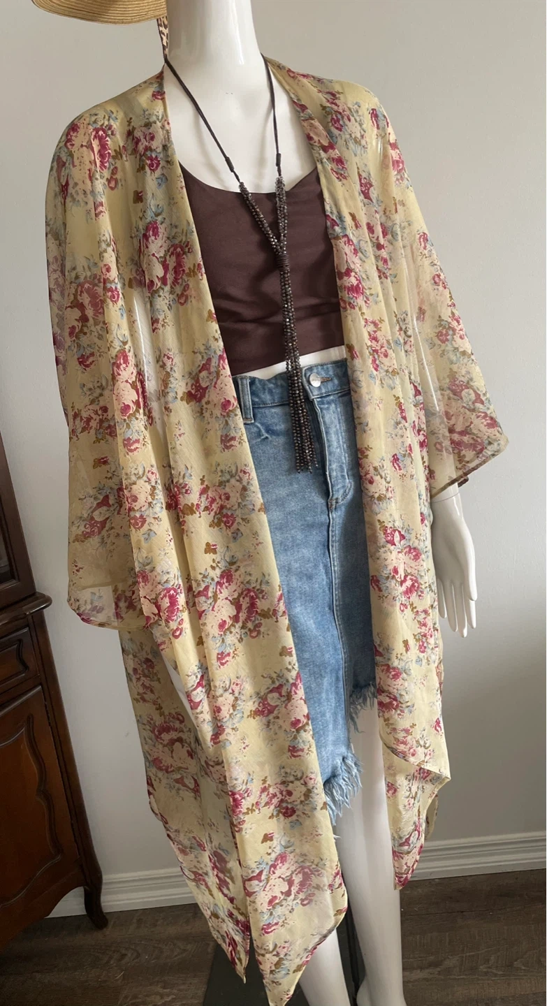 Lightweight sheer kimono featuring a yellow base with a pink and blue floral print. It's a breezy layering piece perfect for warmer weather. Ideal for adding a touch of style over a tank top or dress.